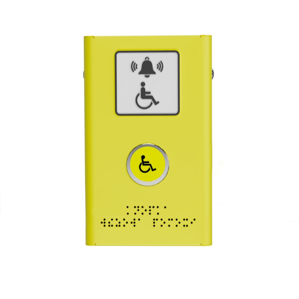 Система вызова помощи применяется в местах общественного пользования, часто с большой проходимостью, в таких случаях для вызова помощи лучше использовать кнопки в антивандальном корпусе. Данное изделие выполнено из нержавеющей стали с порошково-полимерной покраской жёлтого цвета с целью обеспечения контрастного эффекта с подстилающей поверхностью и оптимальных условий восприятия цвета слабовидящими людьми. Устройство предназначено для совместного использования с системой вызова помощи, в качестве беспроводного источника передачи сигнала. Поверхность кнопки имеет тактильное изображение знака инвалид колясочник, а так же надпись с применением системы Брайля «ПОМОЩЬ». Кнопка имеет сенсорную поверхность и срабатывает при касании тактильной зоны. При нажатии кнопки происходит подсвечивание синим цветом.