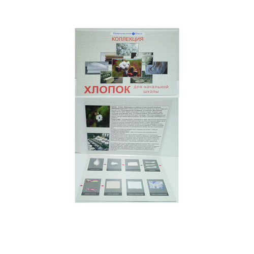 Коллекция состоит из набора натуральных образцов, демонстрирующих основные этапы производства хлопчатобумажных тканей от исходного сырья до готовых изделий (тканей). В коллекции представлены рисунки ветки хлопчатника с цветком и плодом – коробочкой и отдельно коробочки с волокном. Также дано описание к процессу производства. Коллекция используется как для демонстрации, так и для раздачи на парты при условии бережного отношения к образцам. Коллекция упакована в термоусадочную прозрачную плёнку.