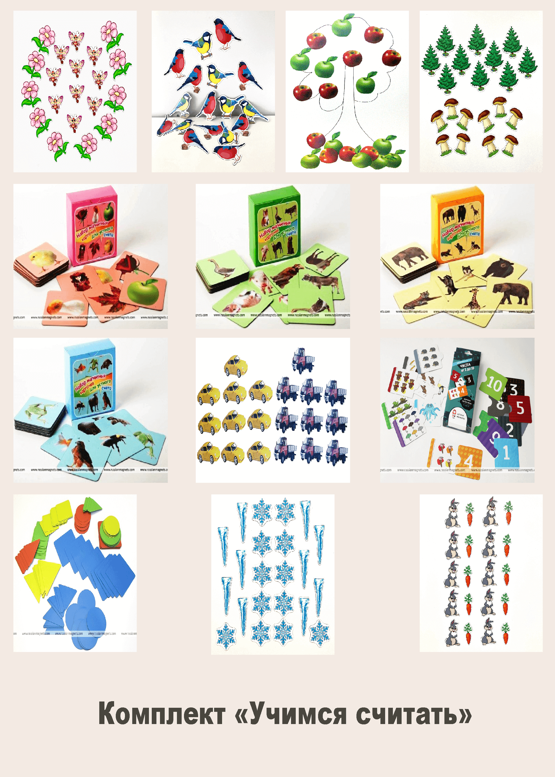 размер снежинки: 6 см х 7 см - 12 штук.) 10. "Ёлочки и грибы" для устного счета: магнитные карточки - 20шт. (размеры: 8 см х 10 см и 7 см х 6 см.) 11. "Бабочки и цветы" для устного счета: магнитные карточки - 20шт. (размеры: 10 см х 10 см и 7 см х 7 см) 12. "Яблоки" для устного счета: магнитные карточки - 20шт. (размер 7 см х 7 см). 13. "Птицы" для устного счета: магнитные карточки - 20шт. (размер от 6 см х 7 см). 14. "Автомобили" для устного счета: магнитные карточки - 20шт. (размеры: 11,7 см х 5,3 см и 11,2 см х 5,7 см).