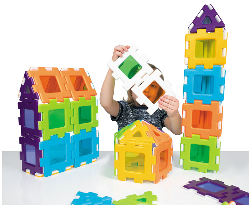 При помощи этого конструктора дети в процессе игры смогут уже в раннем возрасте развить пространственное мышление, осваивая работу с двух- и трёхмерными фигурами. Включает в себя две главные геометрические фигуры — квадрат и треугольник 5 цветов (желтый, голубой, зеленый, оранжевый, фиолетовый). Цветные детали разработаны, чтобы помочь детям исследовать смешивание цветов и строительство в увлекательной форме, выглядят эффектно на светлом столе или против источника света. Конструктор состоит из 72 деталей.