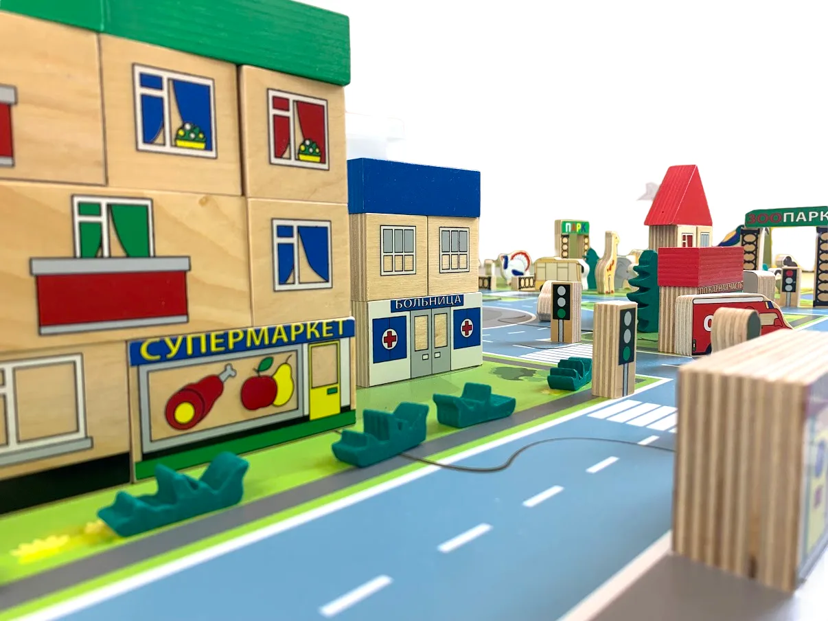 Детский деревянный конструктор "Город" расширенный - это набор для развития мелкой моторики, воображения и творческих способностей у детей. В наборе есть множество различных деталей, таких как блоки, кубики, крыши, мосты, ограды и т.д. Они изготовлены из высококачественной древесины и имеют гладкую поверхность, что делает их безопасными для детей. В комплекте есть жители города: люди, животные и птицы. Они могут быть размещены на улицах города, в домах и на деревьях. Также есть деревья и кусты, а также различный городской транспорт.