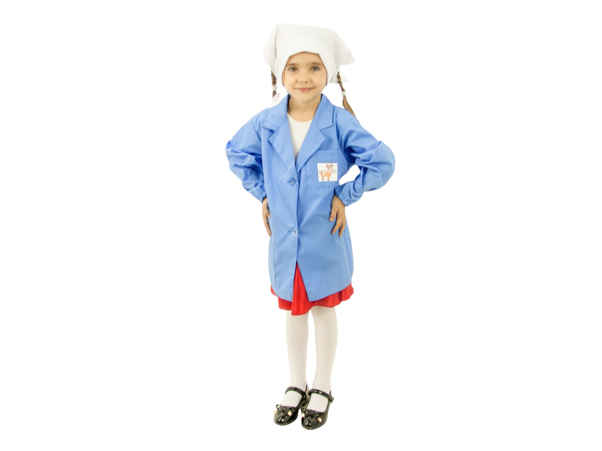 1. Халат на двух пуговицах с завязками сзади и длинными рукавами по низу на резиночке, 2 кармана (на груди и внизу).