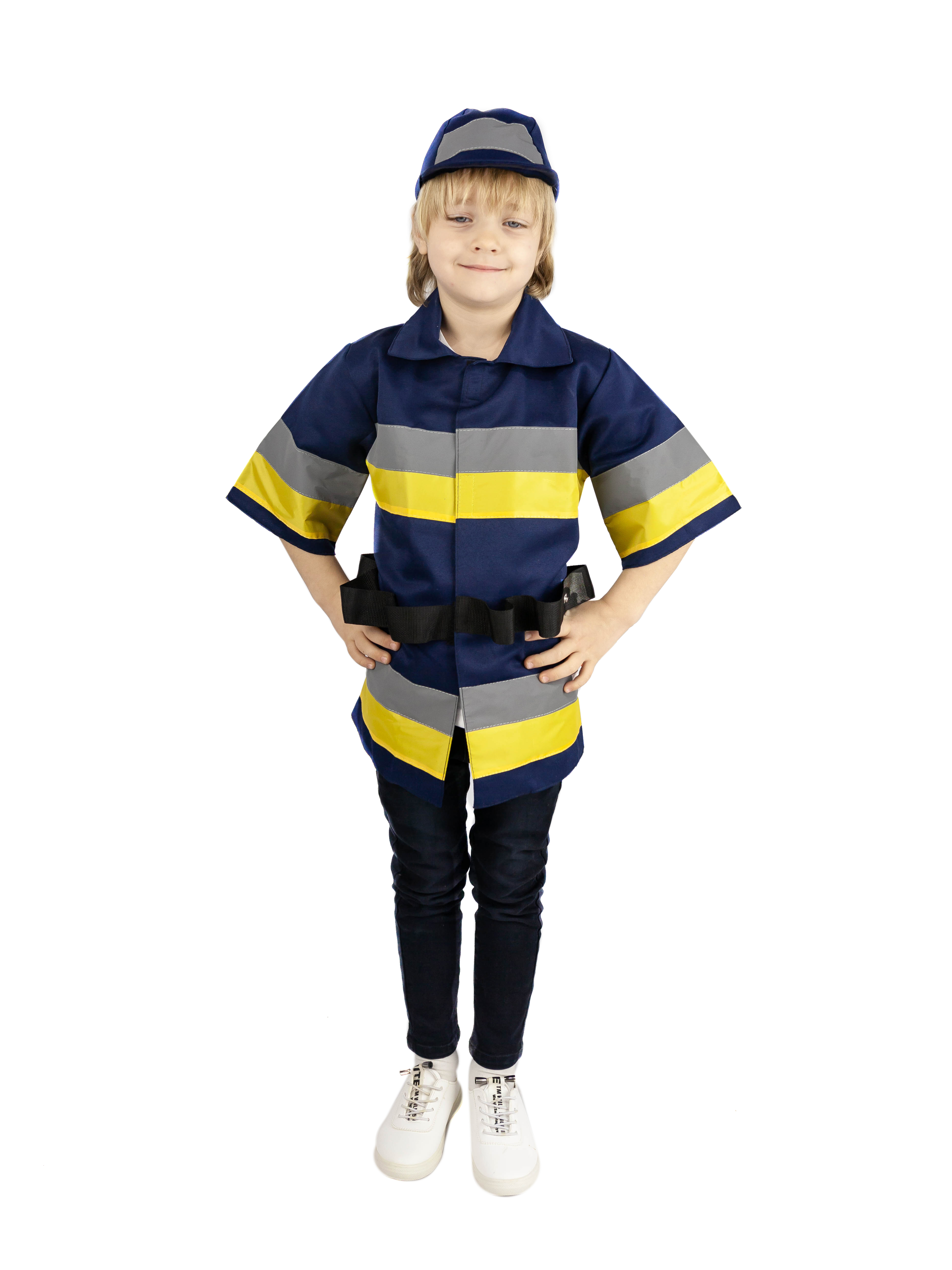 1. Куртка с рукавами и воротником, застежка-липучка, по рукавам, груди и низу куртки проходят желтые полосы и полосы из светоотражающей ленты шириной 5 см, на поясе пришита стропа с петлями для инструментов.