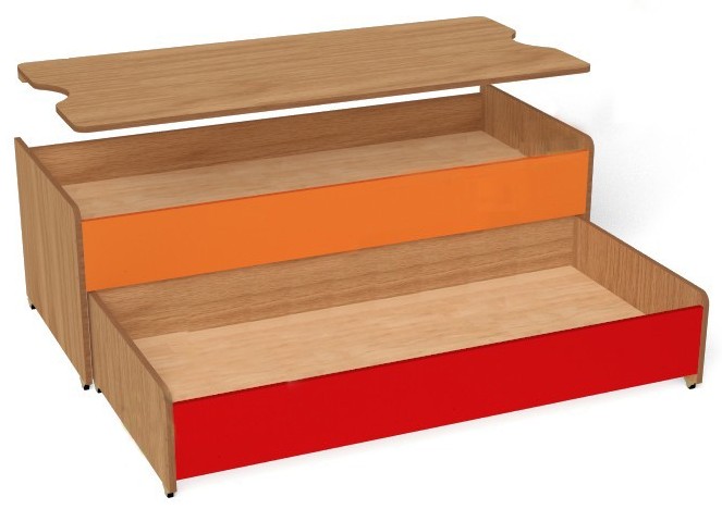 ЛДСП 16 мм, на спинках противоударный врезной кант 2 мм, на остальных деталях кромка 0,4 мм. Задние бортики кроватей выступают, что при выдвижении позволяет кроватям цепляться друг за друга. Нижние части опор(боковин) кроватей оборудованы колесными опора.