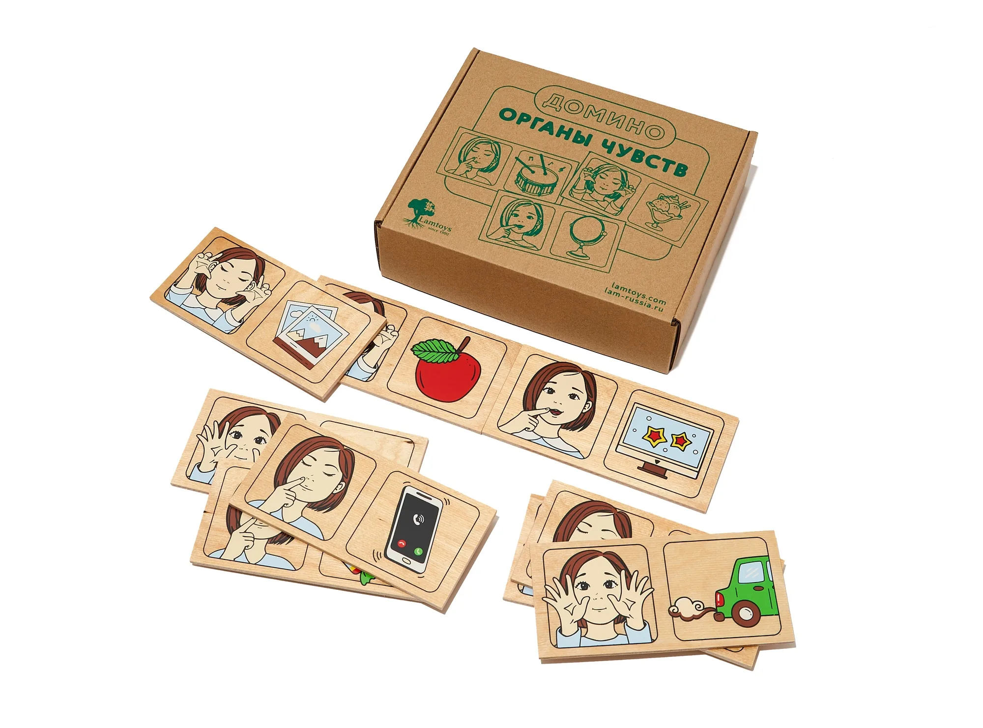 Настольная игра "Органы чувств" включает 20 деревянных прямоугольных карточек и коробку. Каждая карточка с изображением двух картинок - на первой девочка руками указывает на лице органы чувств, а на второй - причина того или иного чувства в виде предмета, еды, явлений.