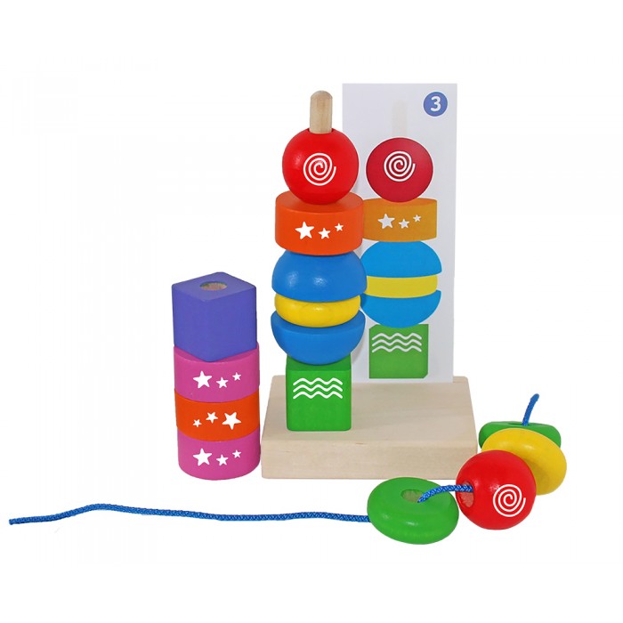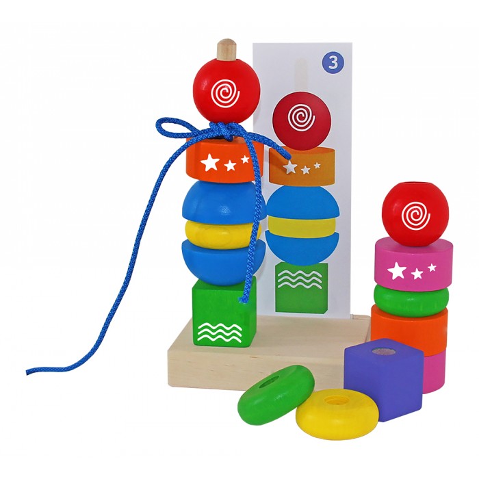 В комплект пирамидки входят 16 разноцветных деталей, 10 игровых заданий и цветной шнур.