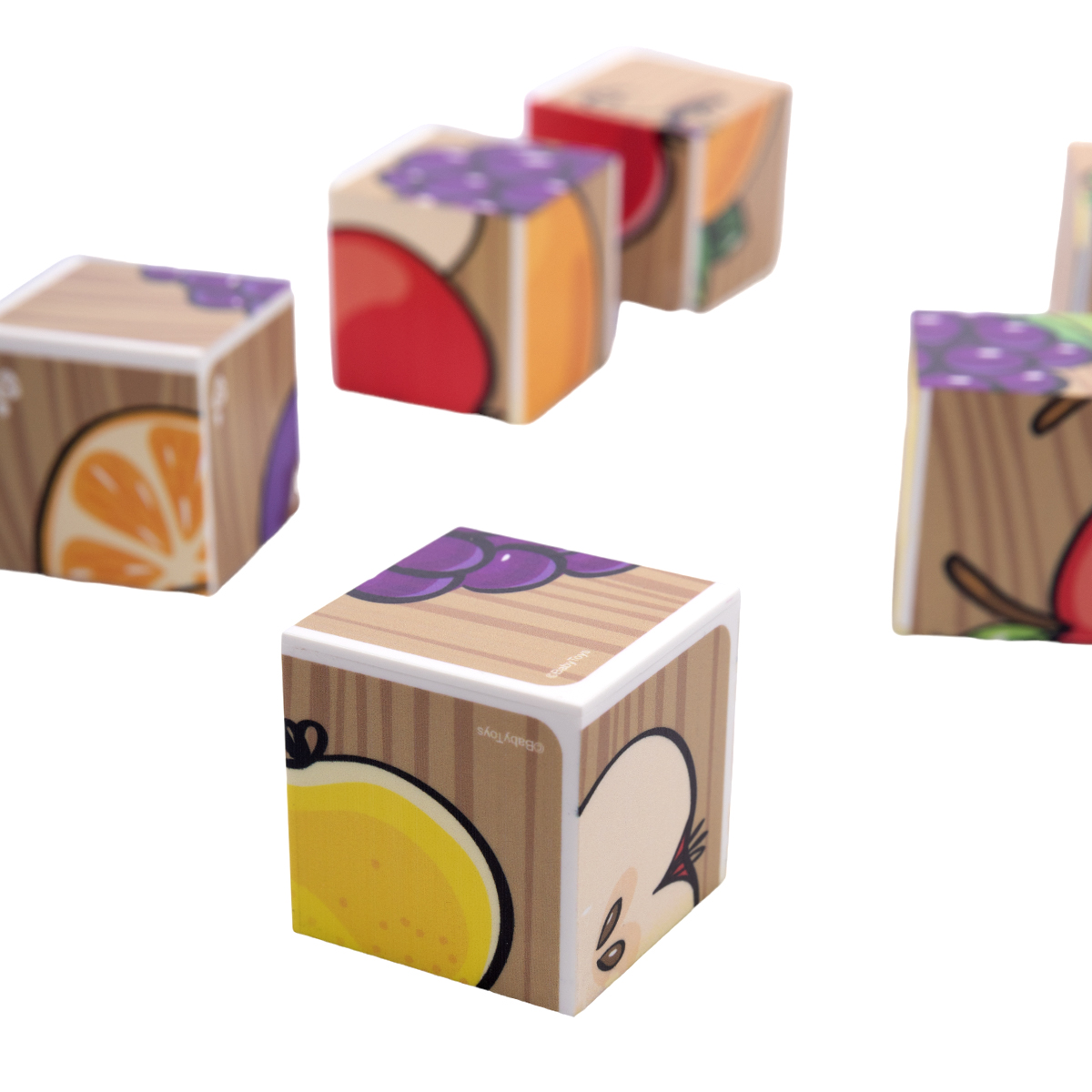 В набор входят 6 кубиков из пластмассы. Картинки нанесены на поверхность кубиков с помощью прямой печати, что, в отличие от обклейки, позволяет изображению дольше оставаться ярким и цельным.