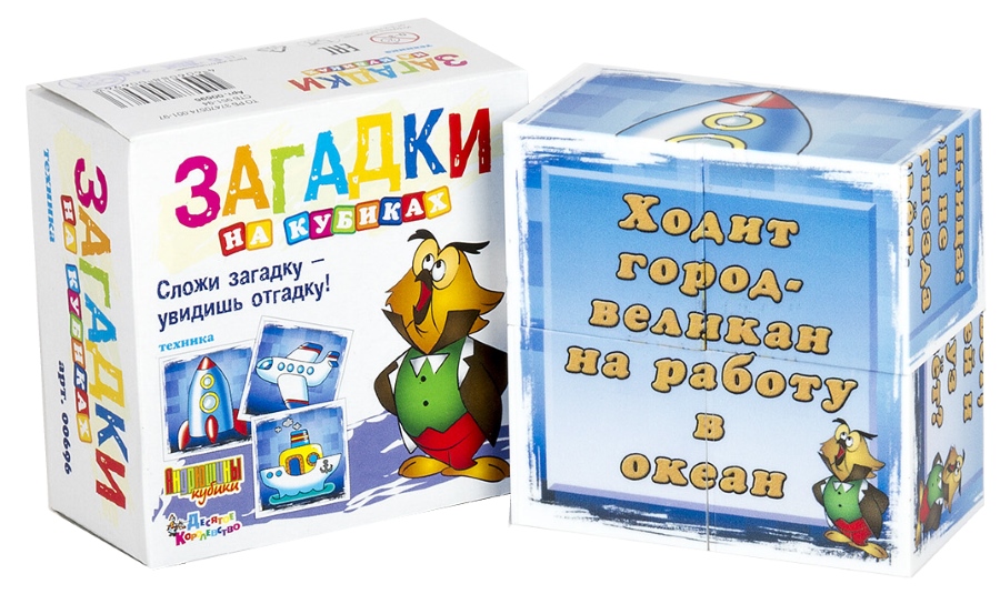 Набор пластмассовых кубиков 4 штуки из серии «Загадки на кубиках» предлагает ребенку собрать и отгадать три загадки на тему «Техника». Для того, чтобы прочитать загадку, может понадобиться помощь взрослых, а малыш должен дать правильный ответ, который можно увидеть, перевернув собранную картинку.