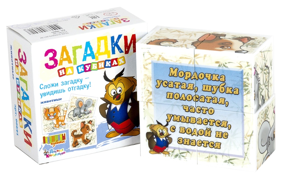 Набор пластмассовых кубиков 4 штуки из серии «Загадки на кубиках» предлагает ребенку собрать и отгадать три загадки на тему «Животные». Для того, чтобы прочитать загадку, может понадобиться помощь взрослых, а малыш должен дать правильный ответ, который можно увидеть, перевернув собранную картинку.
