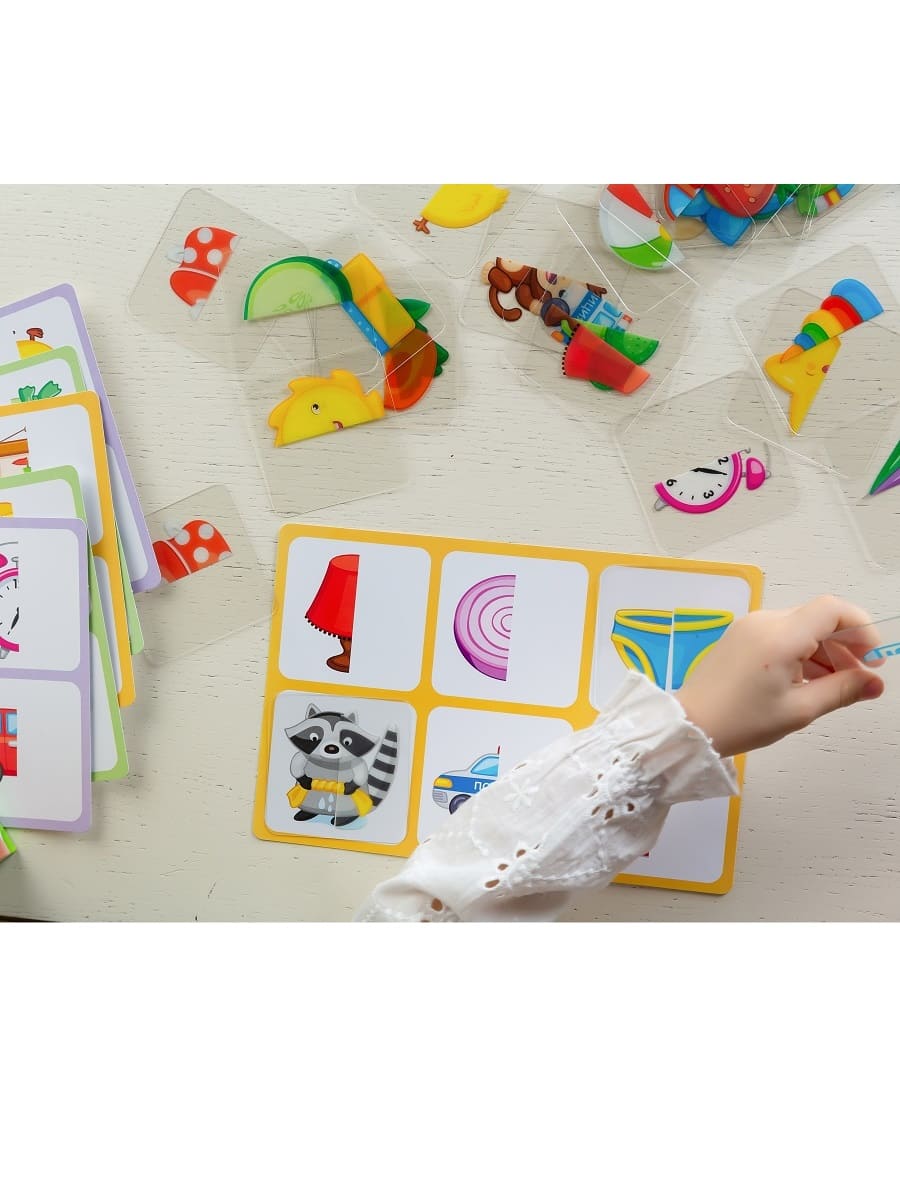 Лото помогает научиться объединять части в целое. Состав игры: игровые поля (14,5 х 21,5 см) – 6 шт., прозрачные карточки с половинками объектов (6,5 х 6,5 см) – 36 шт. Материалы: картон, пластмасса. Для детей от 3 лет, от 1 до 6 человек. В каждой из 6 ячеек игрового поля изображены различные объекты. Необходимо правильно подобрать прозрачные карточки с половинками этих объектов, чтобы при наложении карточки на ячейку игрового поля картинка становилась целой.