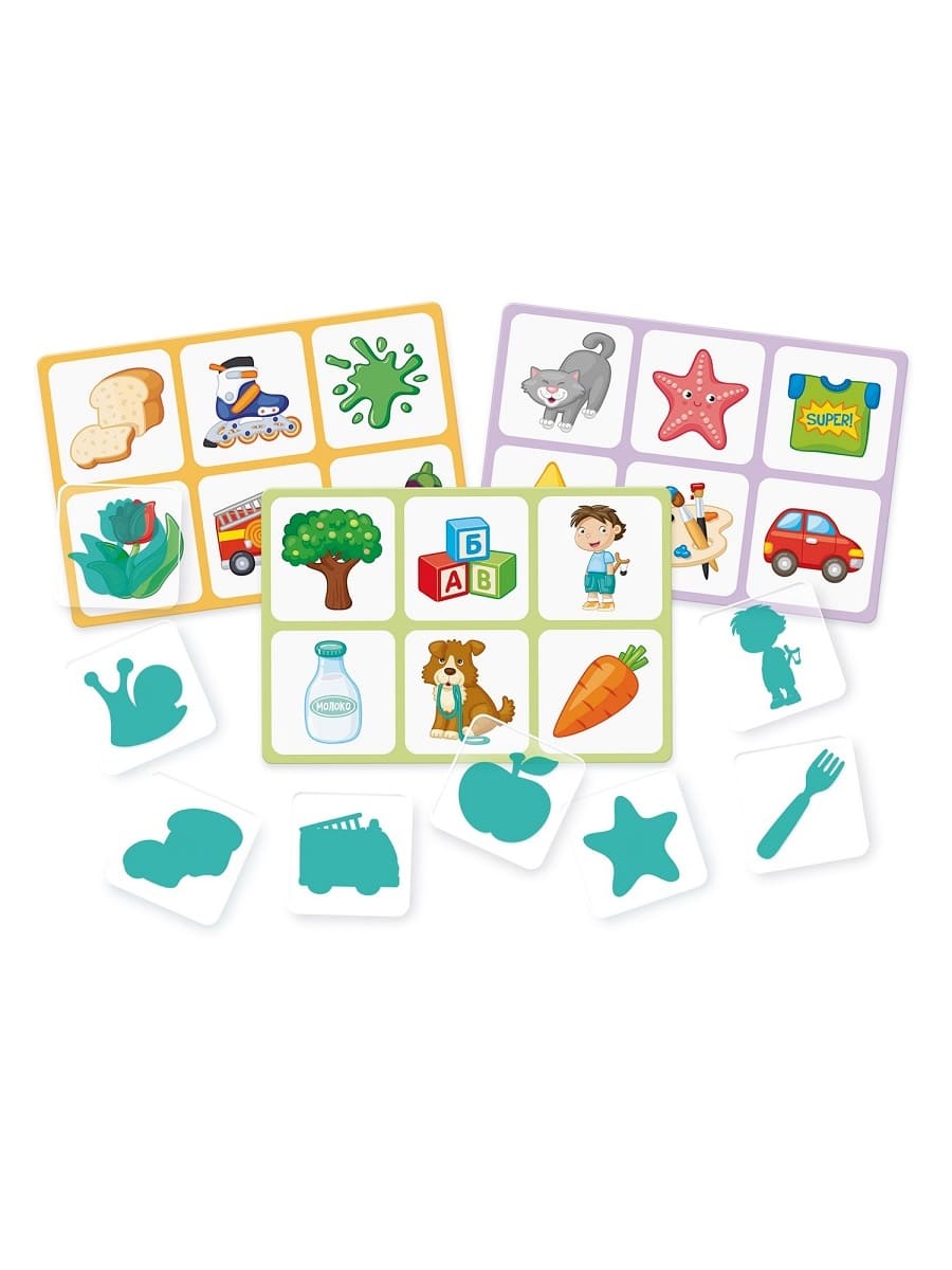Лото помогает научиться сопоставлять силуэты объектов с оригинальными изображениями этих объектов по форме. Состав игры: игровые поля (14,5 х 21,5 см) – 6 шт., прозрачные карточки (6,5 х 6,5 см) – 36 шт. Материалы: картон, пластмасса. Для детей от 3 лет, от 1 до 6 человек. В каждой из 6 ячеек игрового поля изображены различные объекты. Необходимо правильно подобрать прозрачные карточки с силуэтами этих объектов.