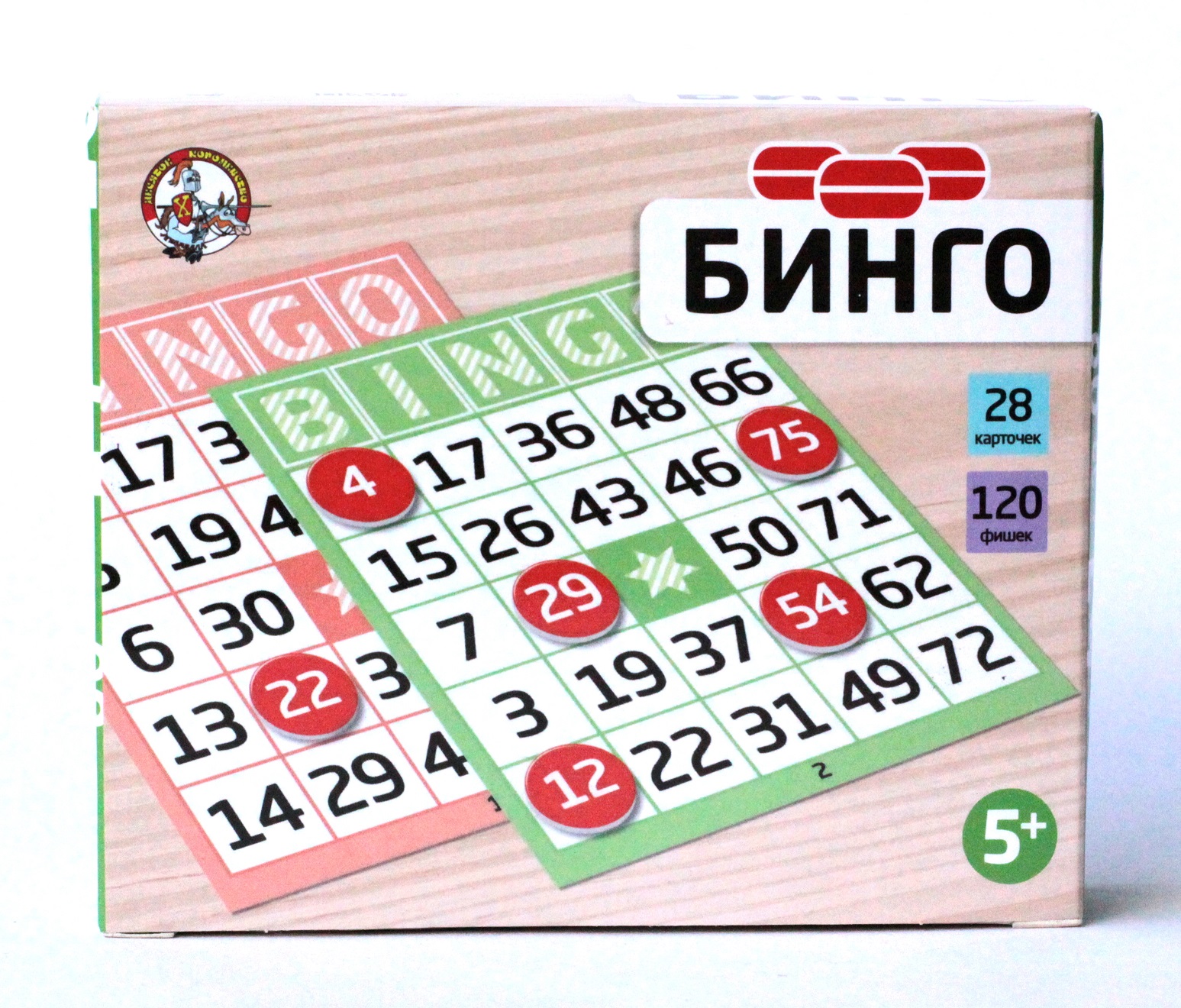 Настольная игра «Бинго» с картонными фишками (серия «Лото для взрослых и детей»). Состав: картонные фишки – 120 шт. (диаметр – 1,5 см), картонные карточки — 28 шт. (9,5 х 11,8 см), мешок — 1 шт. (12 х 18 см). Материал: картон. Для детей от 5 лет, для 2–6 игроков. Игра развивает память и улучшает концентрацию внимания.