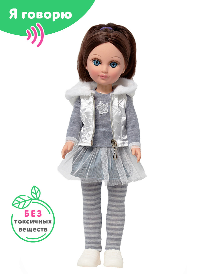 • Элементы костюма, которые легко снимаются и надеваются, погрузят вашего ребенка в мир сюжетно-ролевых игр, в процессе которых развивается мелкая моторика и творческое воображение ребёнка. Кукла озвучена, говорит несколько фраз (до 8 фраз), активирующих к игровой деятельности.