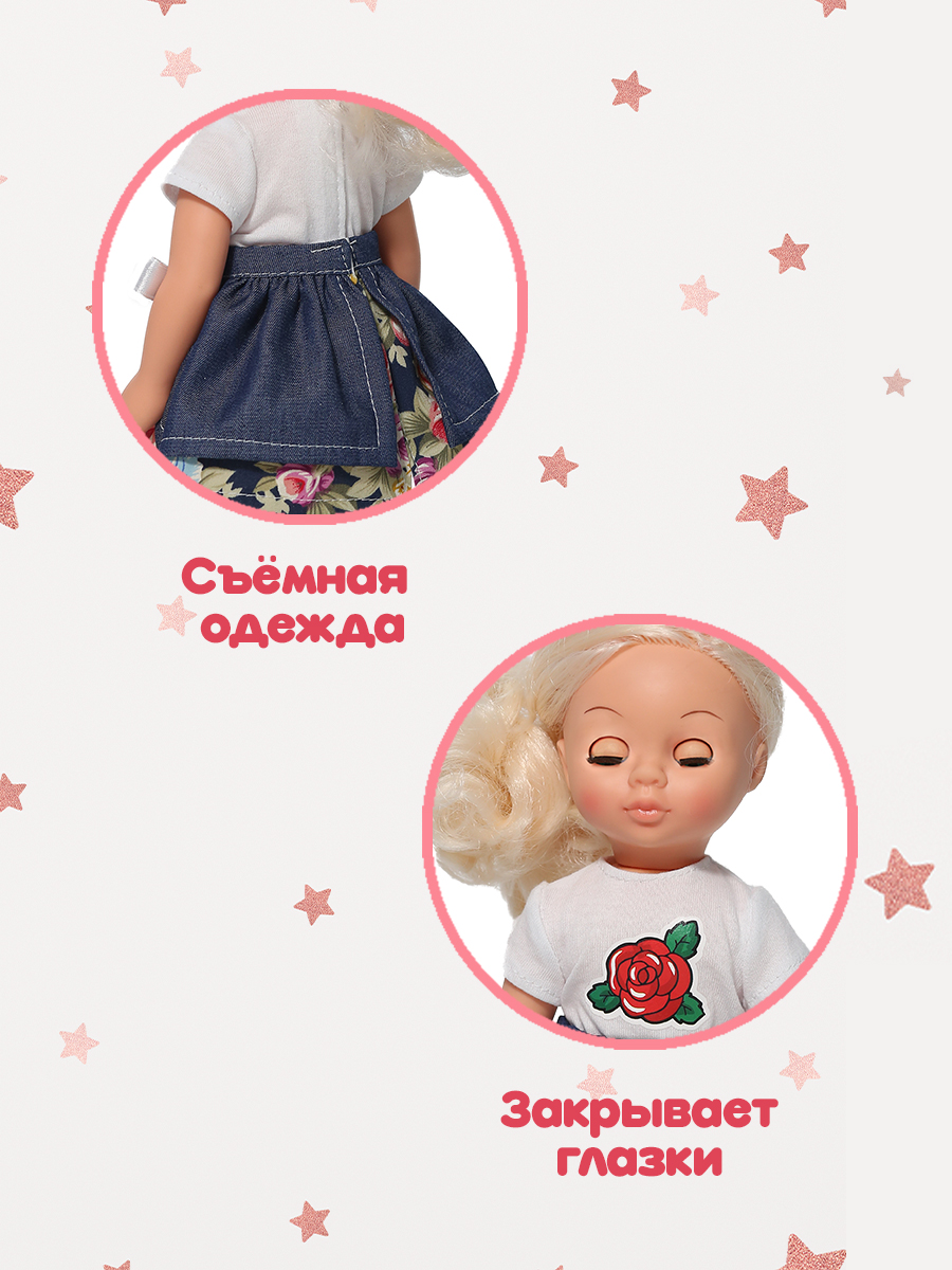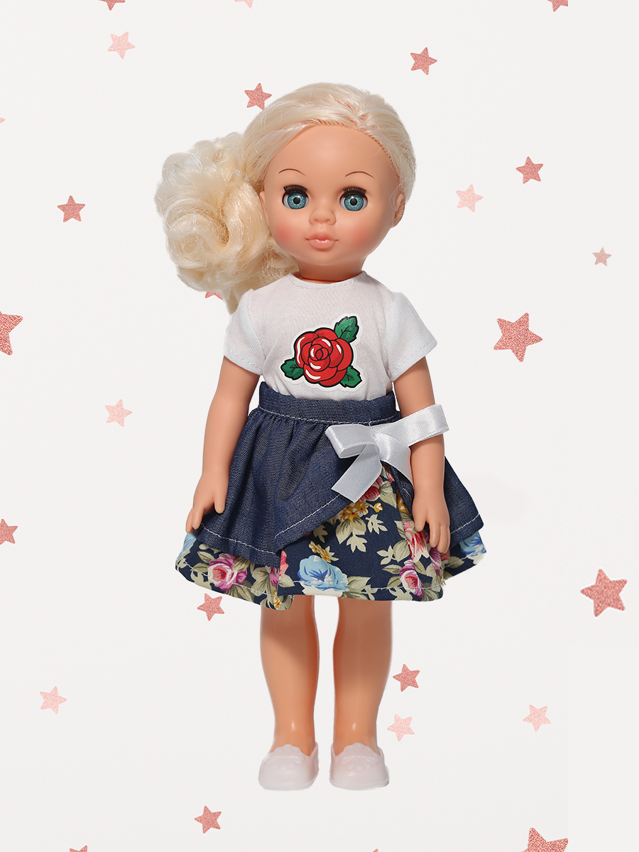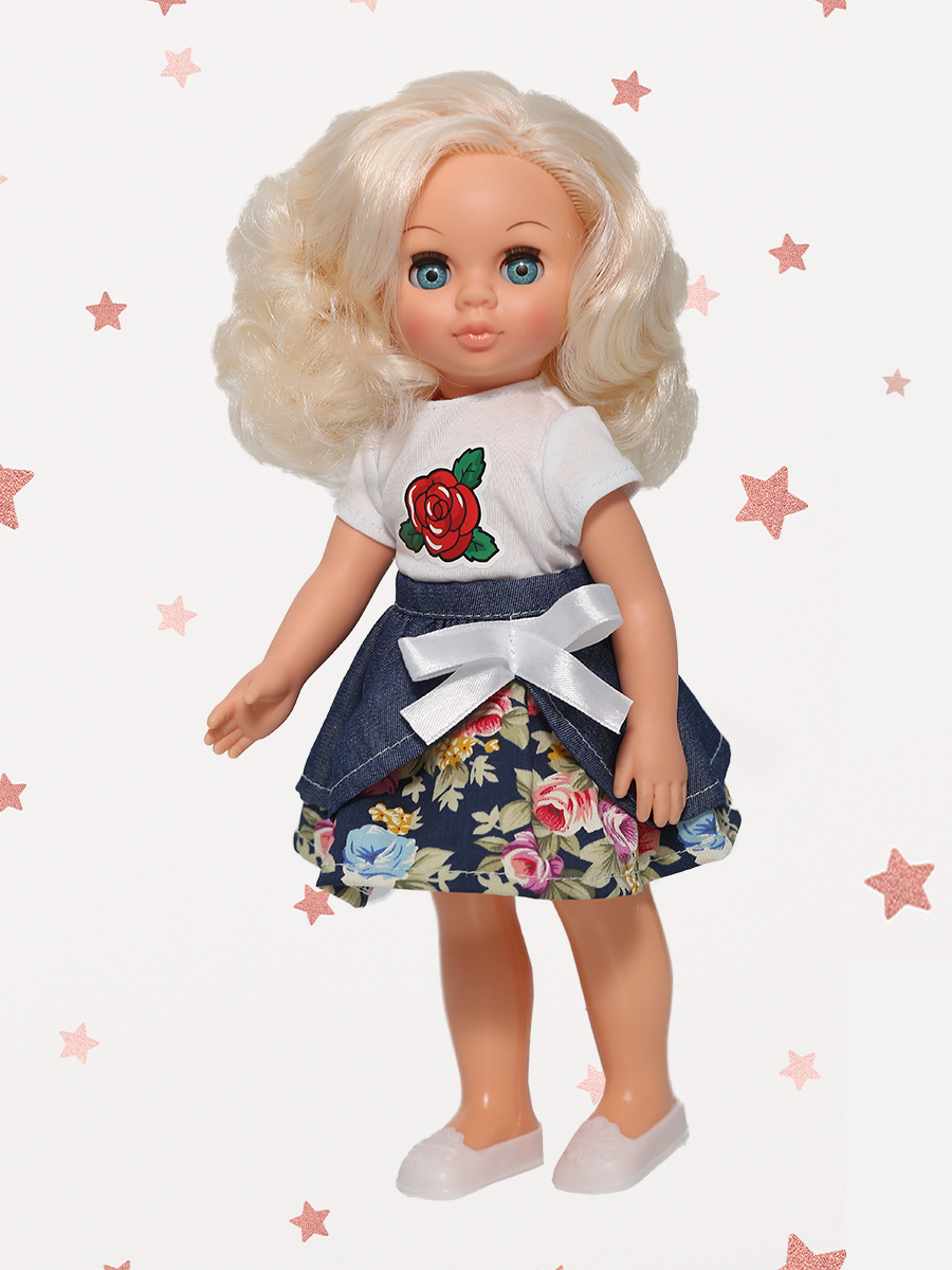 Рост куклы 30 см. Кукла Эля не озвучена. Глаза вставные закрывающиеся. Цвет глаз может варьироваться. Ручки и голова выполнены из эластичного, приятного на ощупь винила, а туловище и ноги из пластмассы.