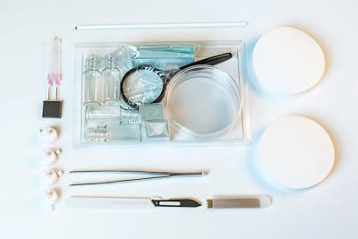 препаровальные иглы – 2 шт. (прямая и изогнутая – по 1 шт.), флаконы с крышками-капельницами – 4 шт., лупа – 1 шт., стеклянная палочка – 1 шт., пинцет – 1 шт., скальпель – 1 шт., предметные стекла – 15 шт., покровные стекла – 200 шт. (2 уп. по 100 шт.), чашки Петри – 2 шт., бумажные фильтры – 200 шт. (2 уп. по 100 шт.), лоток для проведения работ – 1 шт., руководство по эксплуатации – 1 шт.