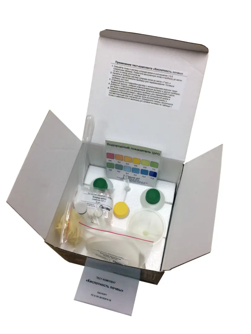 Тест-комплект позволяет оперативно и с достаточной точностью определять количество известковых удобрений, необходимых для внесения в почву с целью нормализации кислотности и повышения плодородия почвы;
