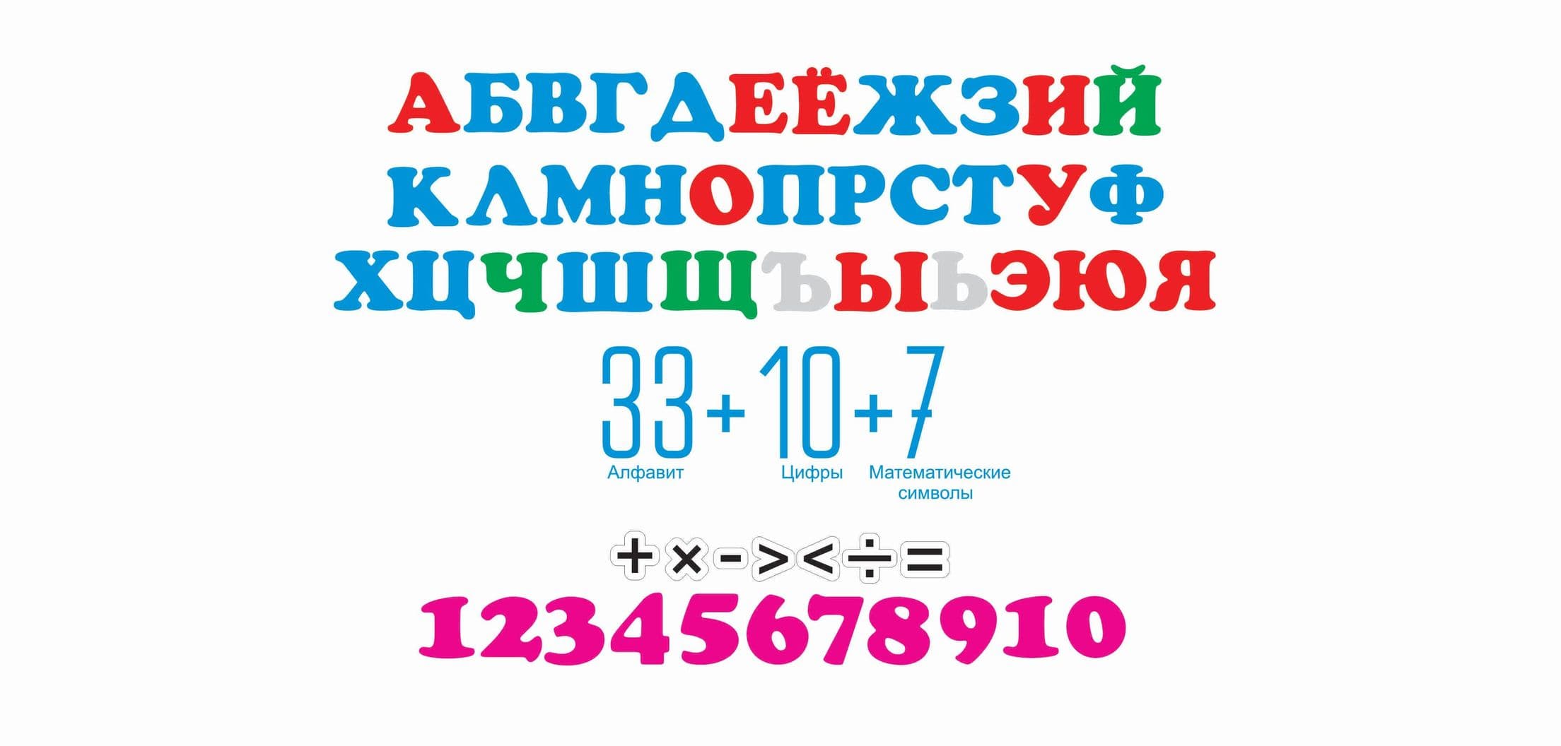 Буквы, цифры и математические символы (70 шт.) + плакат «Алфавит животных» плакат