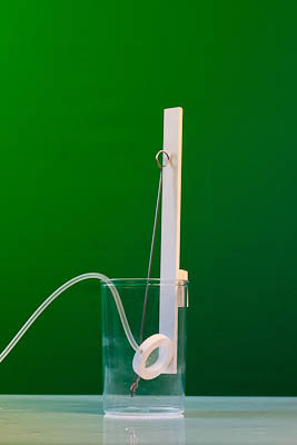 Прибор состоит из датчика давления, прикрепленного к держателю, и силиконовой трубки для соединения с открытым демонстрационным манометром. Датчик может свободно поворачиваться вокруг оси при помощи металлического стержня. Держатель снабжен фиксатором для крепления за край стакана.