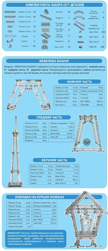 Первоначально металлический конструктор «Эйфелева башня» состоял из 893-х деталей, затем имел в своем составе 909 деталей и, наконец, в сегодняшнем исполнении, имеет 977 деталей. В новом виде этот конструктор избавлен от длинных, неудобных и недостаточно прочных, по отзывам покупателей, деталей.