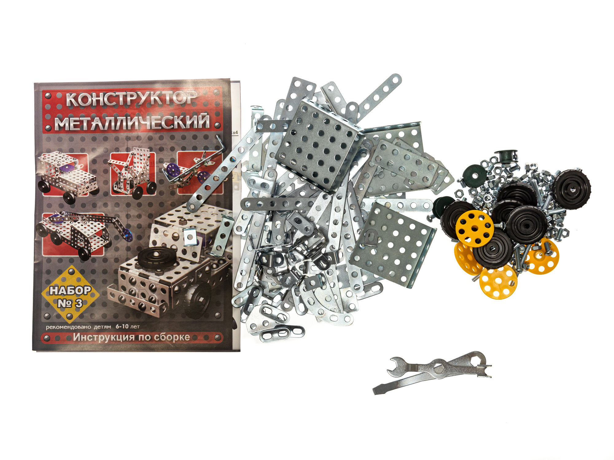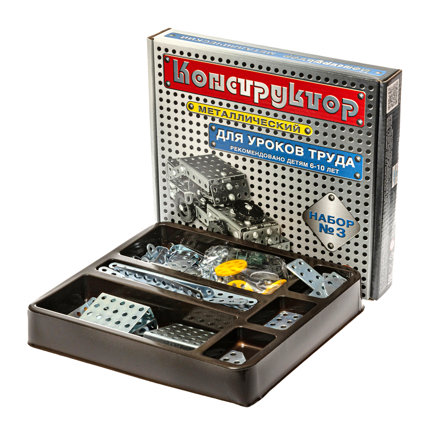 Металлический конструктор №3 для уроков труда. Состав набора: пластина 20 х 20 – 2 шт., пластина 40 х 20 – 4 шт., пластина 50 х 20 – 7 шт.; планка с 2 отверстиями – 10 шт., планка с 3 отверстиями – 4 шт., планка с 5 отверстиями – 6 шт., планка с 10 отверстиями – 6 шт., планка с 15 отверстиями – 6 шт., планка сегментная – 2 шт.; косынка I – 7 шт., косынка II – 7 шт., косынка III – 4 шт.; уголок I – 20 шт., уголок II – 2 шт.; скоба малая – 5 шт., скоба большая – 4 шт., скоба I – 3 шт., скоба II – 4 шт.; панель – 4 шт.; отвёртка – 1 шт.; ключ гаечный – 1 шт.; ось – 3 шт.; винт М 4 х 6 – 60 шт., винт М 4 х 8 – 20 шт., винт М 4 х 20 – 6 шт.; гайка М4 – 90 шт.; планшайба – 4 шт.; колесо – 6 шт.; шкив – 3 шт.; крюк – 1 шт.; инструкция. Всего – 292 элемента. Материалы: металл и пластика. Доступны к сборке 5 моделей: 2 вида автомобиля, самолёт, коляску и кран. Детали имеют размер от 2 до 15 см, толщина металла составляет 0,8 мм. Расстояние между центрами отверстий – 10 мм. Крепёж имеет резьбу М4. Занятия с набором способствуют освоению основ конструирования и инженерного дела, а также развивают мелкую моторику рук, пространственное и логическое мышление.