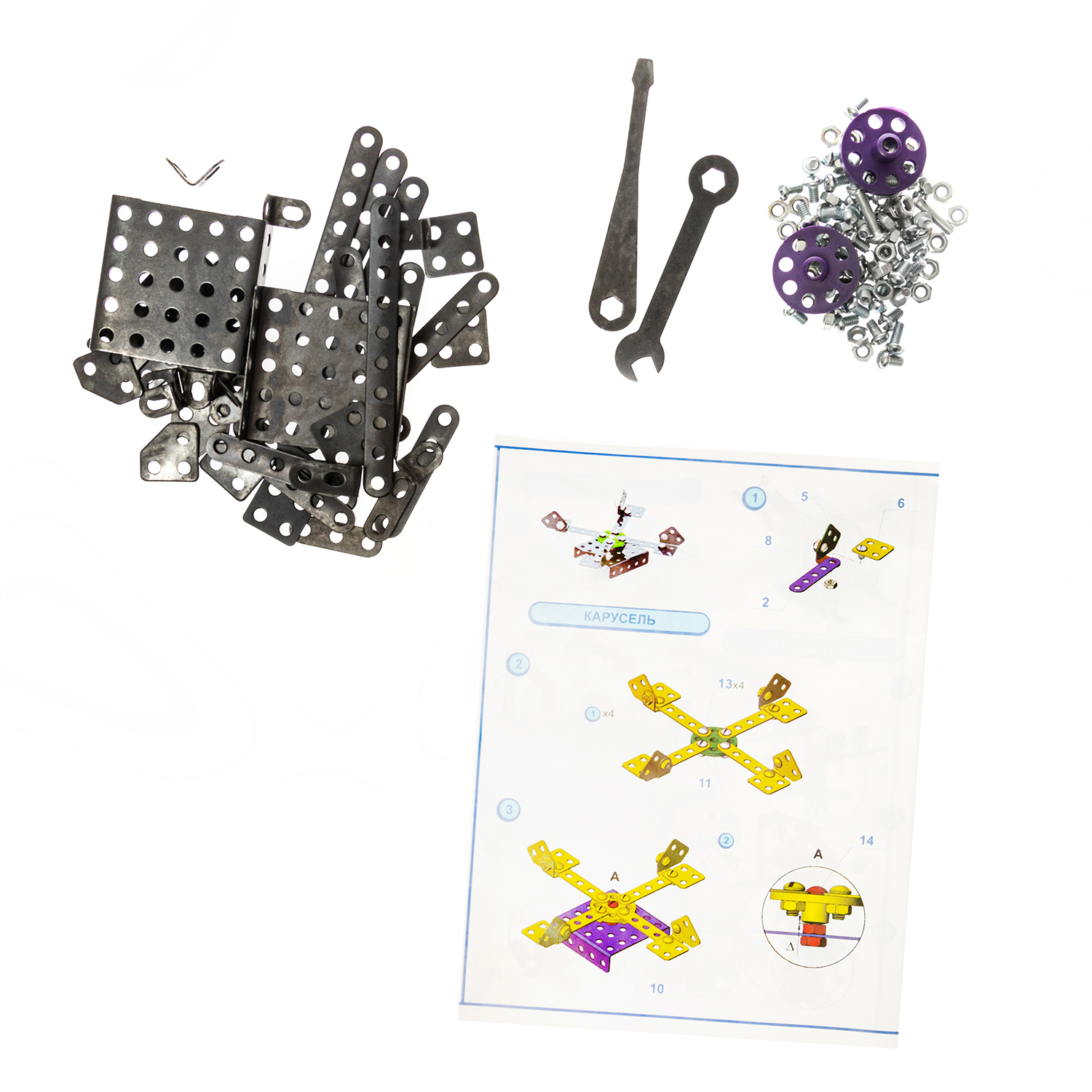 Конструктор металлический «Школьный-2» для уроков труда. Состав набора: планка 10 отверстий – 3 шт., планка 5 отверстий – 9 шт., планка 3 отверстия – 3 шт., планка 2 отверстия – 2 шт., косынка – 6 шт., пластина 20х20 – 4 шт., пластина 50х20 – 2 шт., уголок – 10 шт., скоба большая – 1 шт., панель – 2 шт., план-шайба – 2 шт., винт М4 х 6 – 31 шт, винт М4 х 8 –7 шт., винт М4 х 16 – 3 шт., гайка М4 х 16 – 45 шт., отвёртка – 1 шт., гаечный ключ – 1 шт., инструкция со схемой сборки – 1 шт. Материалы: металл, пластмасса. Для детей старше 7 лет.