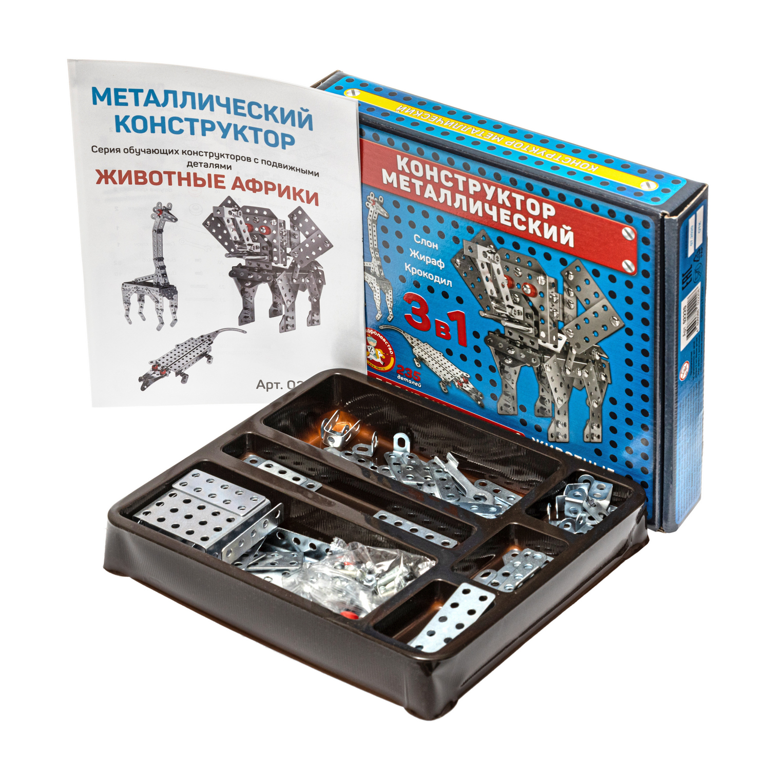 Конструктор металлический «Животные Африки» для уроков труда (слон, жираф и крокодил). Состав набора (всего 235 деталей): детали конструктора – 233 шт., гаечный ключ – 1 шт., отвёртка – 1 шт., инструкция. Материал: металл, пластик, бумага. Конструктор предназначен для детей 6–10 лет. Занятия с металлическим конструктором способствуют развитию мелкой моторики рук, осязания, воображения, логики и пространственного мышления, а также закладывают основы знаний по моделированию.