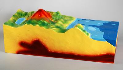 Модель состоит из 2 частей, изготовлена из пластмассы и раскрашена. На разрезе, проходящем через центр вулкана, показаны магма, жерло вулкана, кратер, лава, побочные кратеры. Показано изменение поверхности Земли в результате вулканической деятельности.