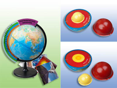 Дополнительно элементы внутреннего строения Земли представлены полусферами "Ядро" и "Мантия", согласованными по цвету с диском, на котором они фиксируются магнитами. Внутренняя поверхность полусферы "Северное полушарие" обозначает земную кору и также согласована по цвету с диском.