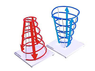 Пособие состоит из моделей циклона и антициклона, имеющих спиралевидную форму и устанавливаемых на подставке. В соответствии с общепринятым обозначением синяя спираль представляет циклон, красная – антициклон. Цветные стрелки, входящие в комплект, обозначают нисходящие и восходящие потоки воздуха.