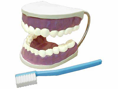 Модель демонстрирует строение челюстей человека (масштаб 5:1). Изготовлена из пластмассы и снабжена подвижными металлическими креплениями, позволяющими демонстрировать строение зубов, а также правила ухода за ними. В комплект входит муляж зубной щетки.