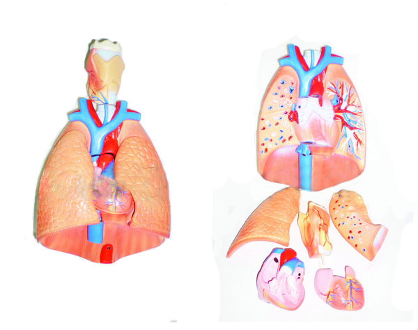 Модель представляет собой систему органов дыхания человека, изготовлена из пластмассы, установлена на подставку, все органы и сосуды раскрашены в цвета приближенные к естественным. Модель изображает фронтальный разрез грудной области человека, на которой можно рассмотреть строение гортани, внутреннего строения легких, внутреннего строения сердца, артерий и сосудов человека. Модель разборная имеет съемные части: гортань, легкое правое, легкое левое, сердце (две части).