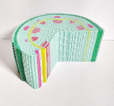 Модель изготовлена из пластмассы и раскрашена в контрастные цвета. Модель демонстрирует поперечный и продольный срез стебля растения, позволяет рассмотреть следующие детали строения стебля растения: пробка, камбий, волокна, сосуды, ситовидные трубки, клетки сердцевины.