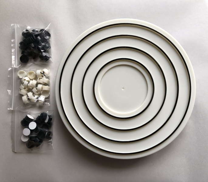 Набор для моделирования электронного строения атомов изготовлен из пластмассы. Представляет собой два основания, имитирующие электронные уровни атомов, на которых можно моделировать с помощью наборов протонов, нейронов, электронов различные модели атомов.