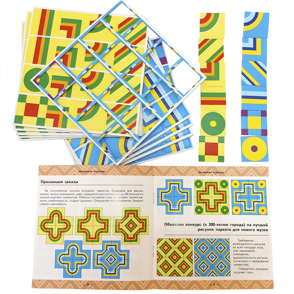 У ребенка – карточки с нанесенными на них элементами узора, соединение которых позволит ему создать множество дизайнерских проектов, от бордюра до мозаичного настенного панно.