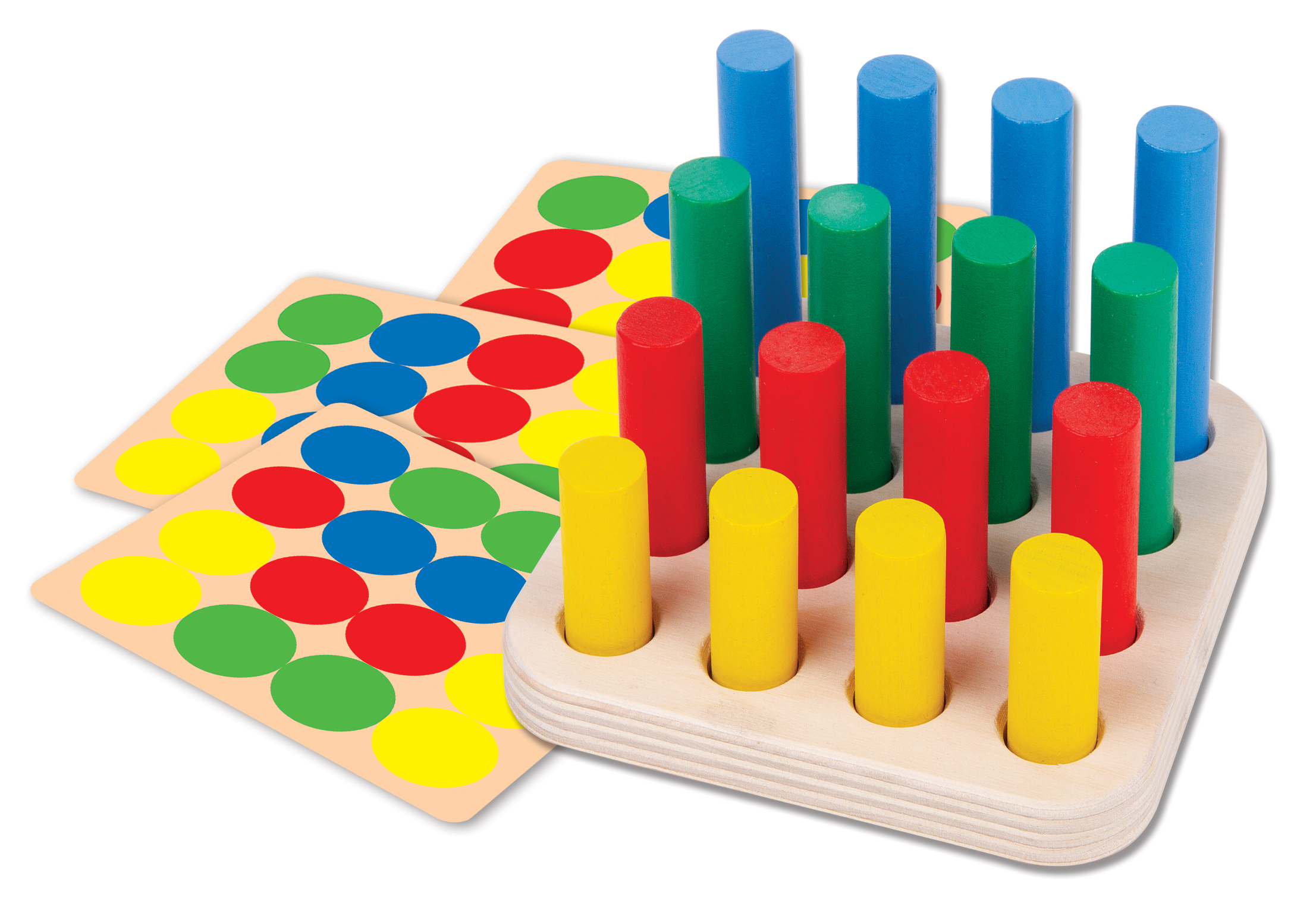 Состав набора: деревянное поле с углублениями для столбиков – 1 шт. (14 х 14 см, толщина – 1 см; всего на поле 16 углублений диаметром 2 см), деревянные столбики 4 цвета – 16 шт. (синий, длина – 7 см, зелёный, длина – 6 см, красный, длина – 5 см, желтый, длина – 4 см, диаметр каждого столбика – 1,8 см) двусторонние карточки с заданиями – 3 шт. (11 х 11 см).