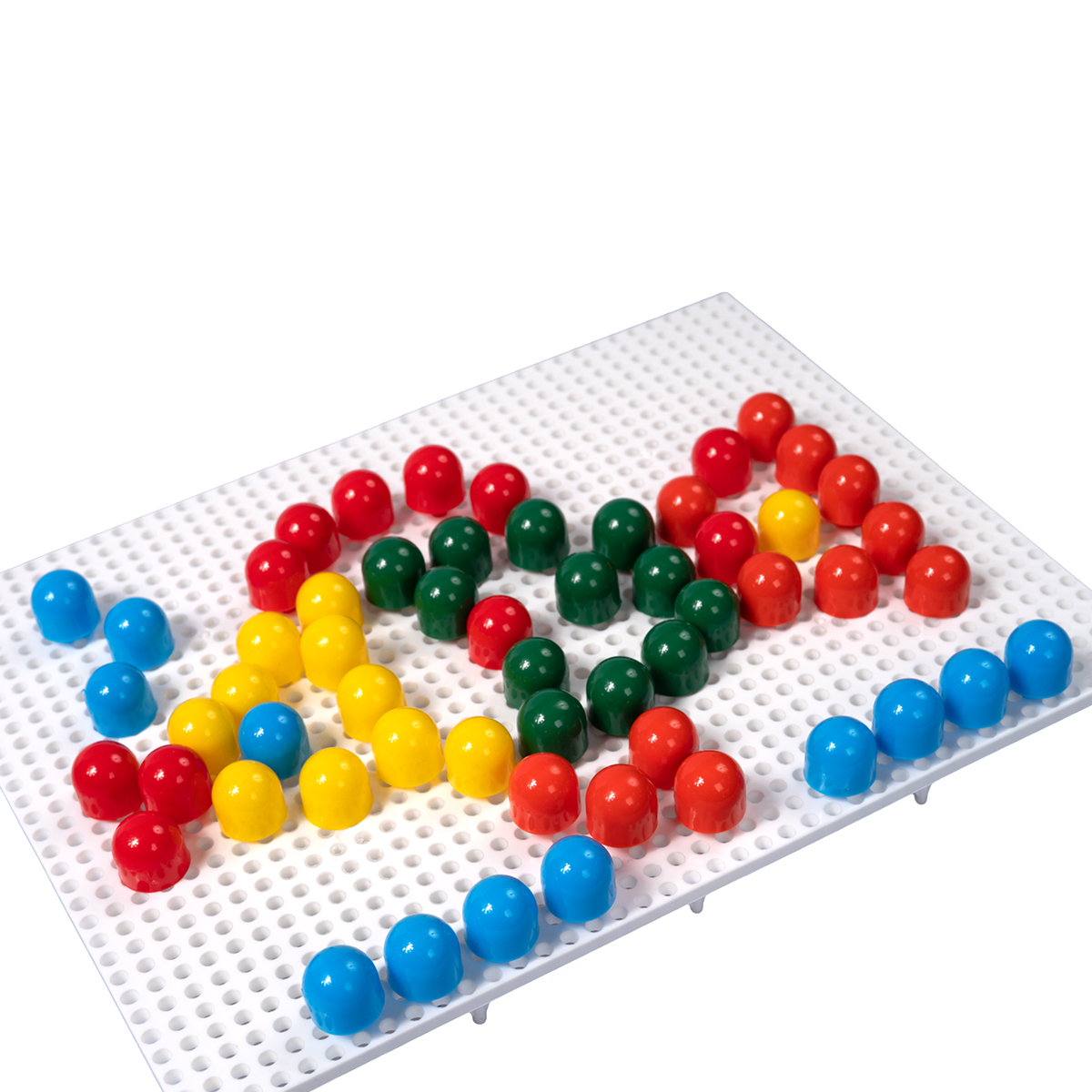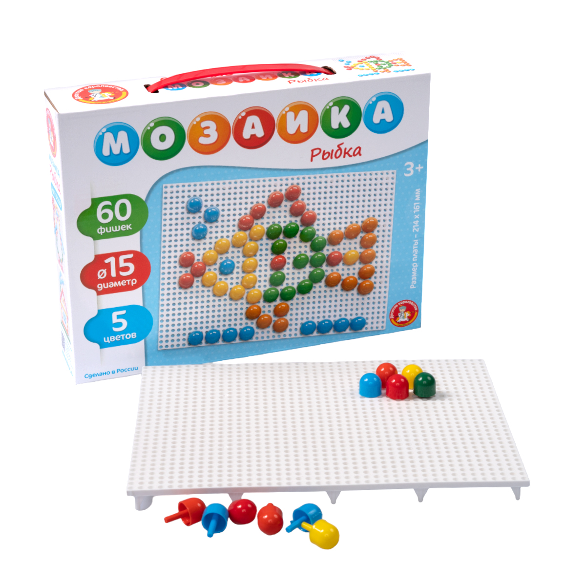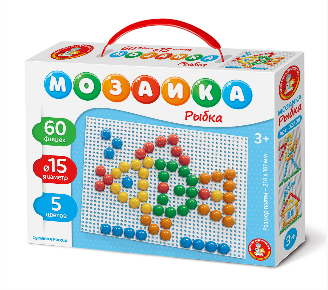 Мозаика для малышей «Рыбка» (60 эл.). Состав: плата – 1 шт. (16,5 х 21,5 см), цветные фигурные фишки – 60 шт. (5 цветов: красный, зелёный, оранжевый, жёлтый, синий; диаметр – 1,5 см). Материал: пластмасса. Для детей от 3 лет. Работая с мозаикой, ребёнок развивает воображение, внимательность и логику, тренирует мелкую моторику рук, а также усваивает такие понятия, как часть и целое, и учится различать цвета.