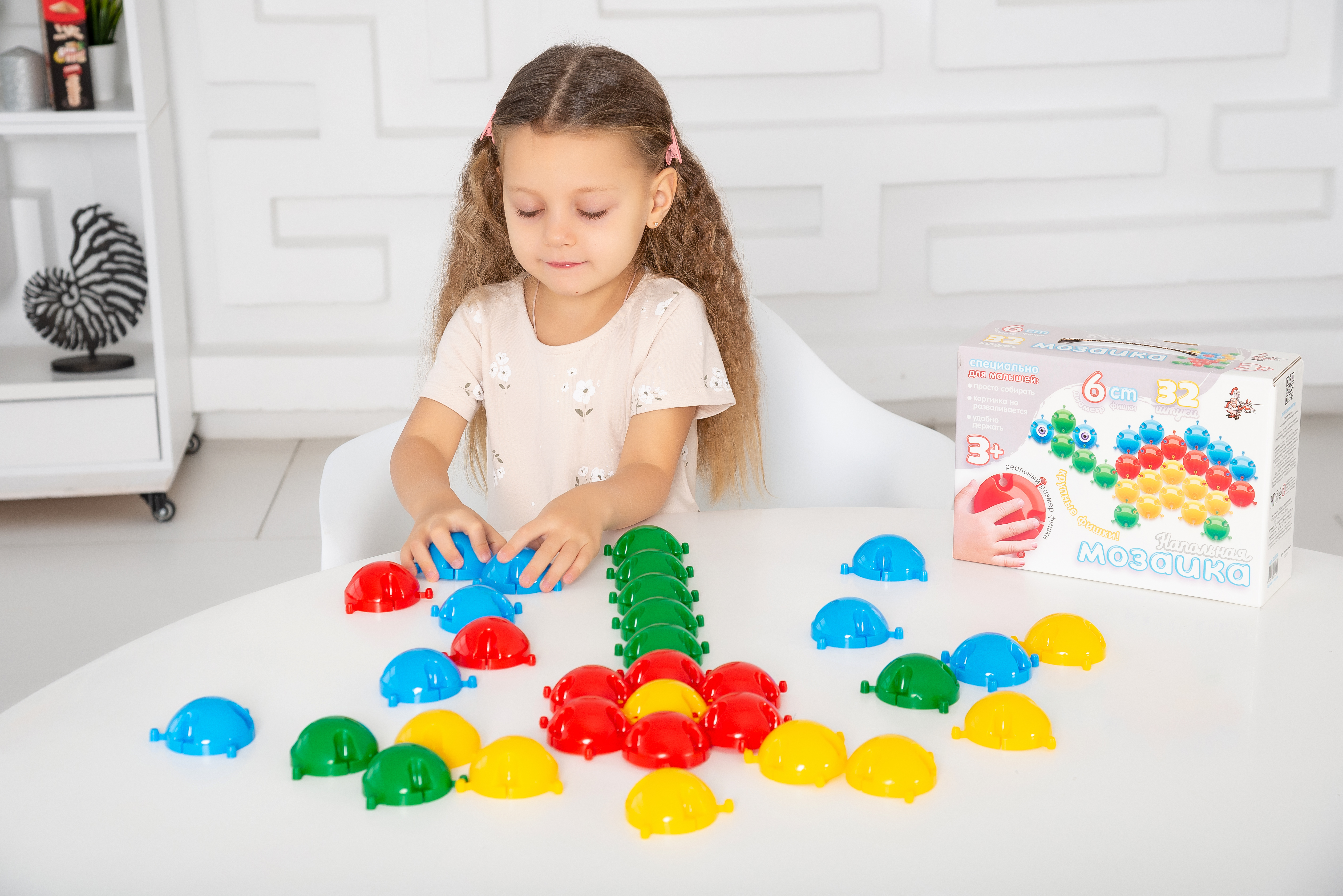 Как и все мозаики данной серии, эта напольная мозаика предназначена специально для самых маленьких детей в возрасте от 2-х лет. Крупные шести-сантиметровые фишки безопасны для ребенка и хорошо ложатся в ладошку. Рекомендуемые картинки достаточно лаконичны для того, чтобы малышу не наскучило собирать любую из них. Специальные крепления легко соединяют фишки между собой, но в то же время делают картинки достаточно стабильными, их можно двигать, приподнимать и даже осторожно переносить. А когда ребенок закончил играть мозаику достаточно просто сложить стопкой, поэтому они не потеряются и займут мало места при хранении.