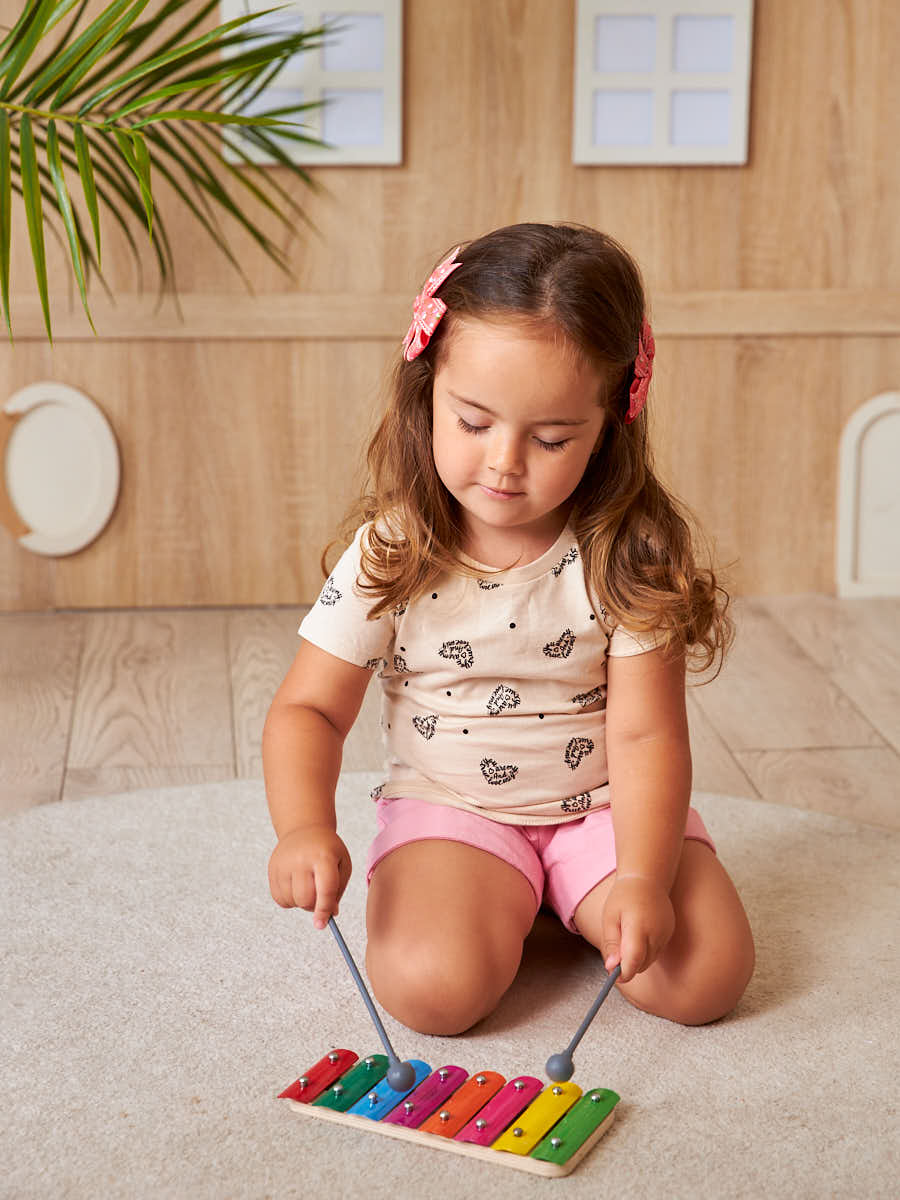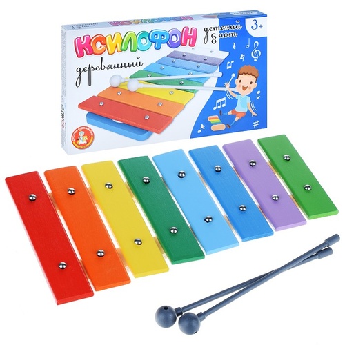 Музыкальный инструмент «Ксилофон» 8 нот. Состав: ксилофон, 8 нот (длина – 28,5 см, ширина – от 11 до 15,5 см), палочки – 2 шт. (19 см). Материал: дерево, фанера, металл и пластмасса. Рекомендовано для детей от 3 лет. Занятия с ксилофоном способствуют развитию музыкального слуха, чувства ритма, памяти, координации движений, а также мелкой моторики.
