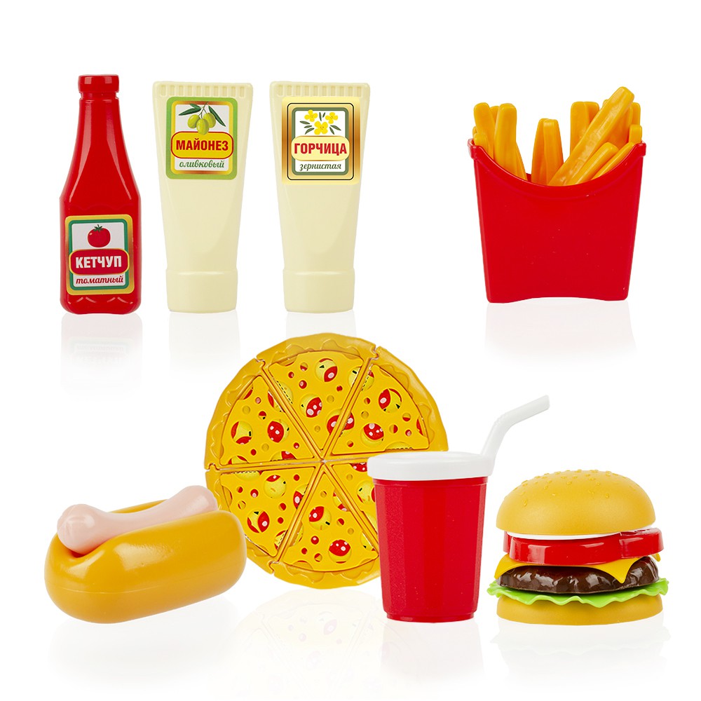 Состав: бургер, хот дог, пицца, картофель фри, кетчуп, майонез, горчица, стакан с трубочкой.
