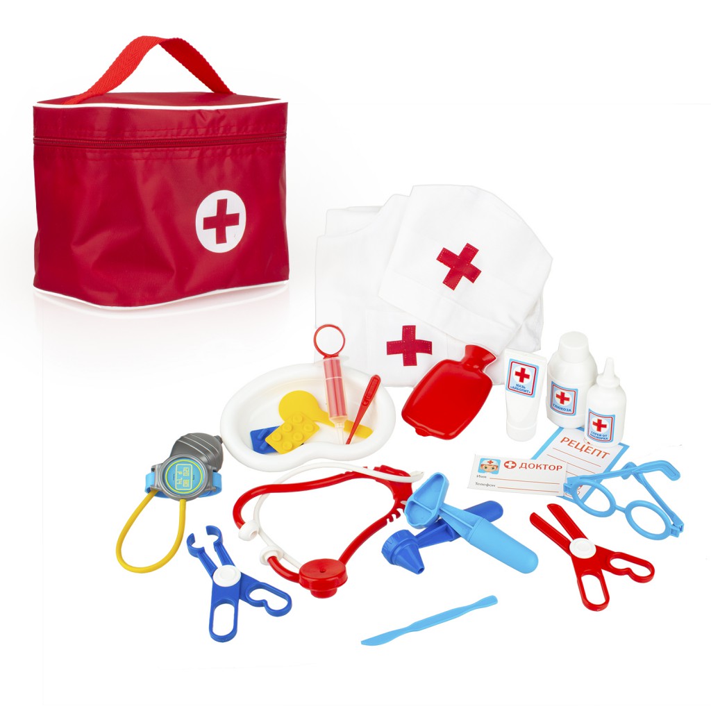 мазь, спрей, глюкоза, очки,термометр.шприц.,ларингоскоп, молоток, лопатка окулиста, тонометр, таблетки круглые, таблетки овальные, скальпель, фонендоскоп, ванночка,щипцы, ножницы, грелка, визитка доктора, рецепты, костюм докторв, сумка ПВХ .