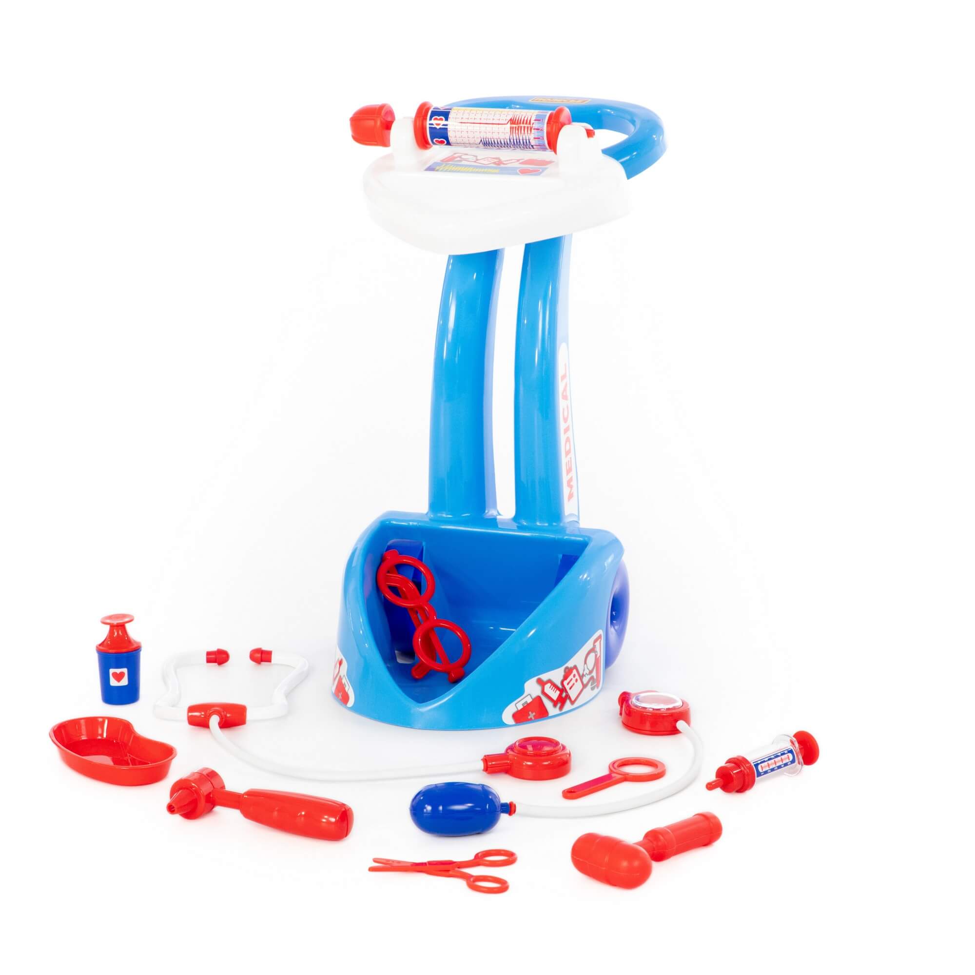 Представлен в виде игровой панели на тележке. В комплект входит: ножницы, очки, лупа, шприц, лоток для инструментов, стетоскоп для прослушивания сердца и лёгких, тонометр для измерения давления, отоскоп инструмент лор-врача, кардиограф, молоточек и баночка с крышкой.