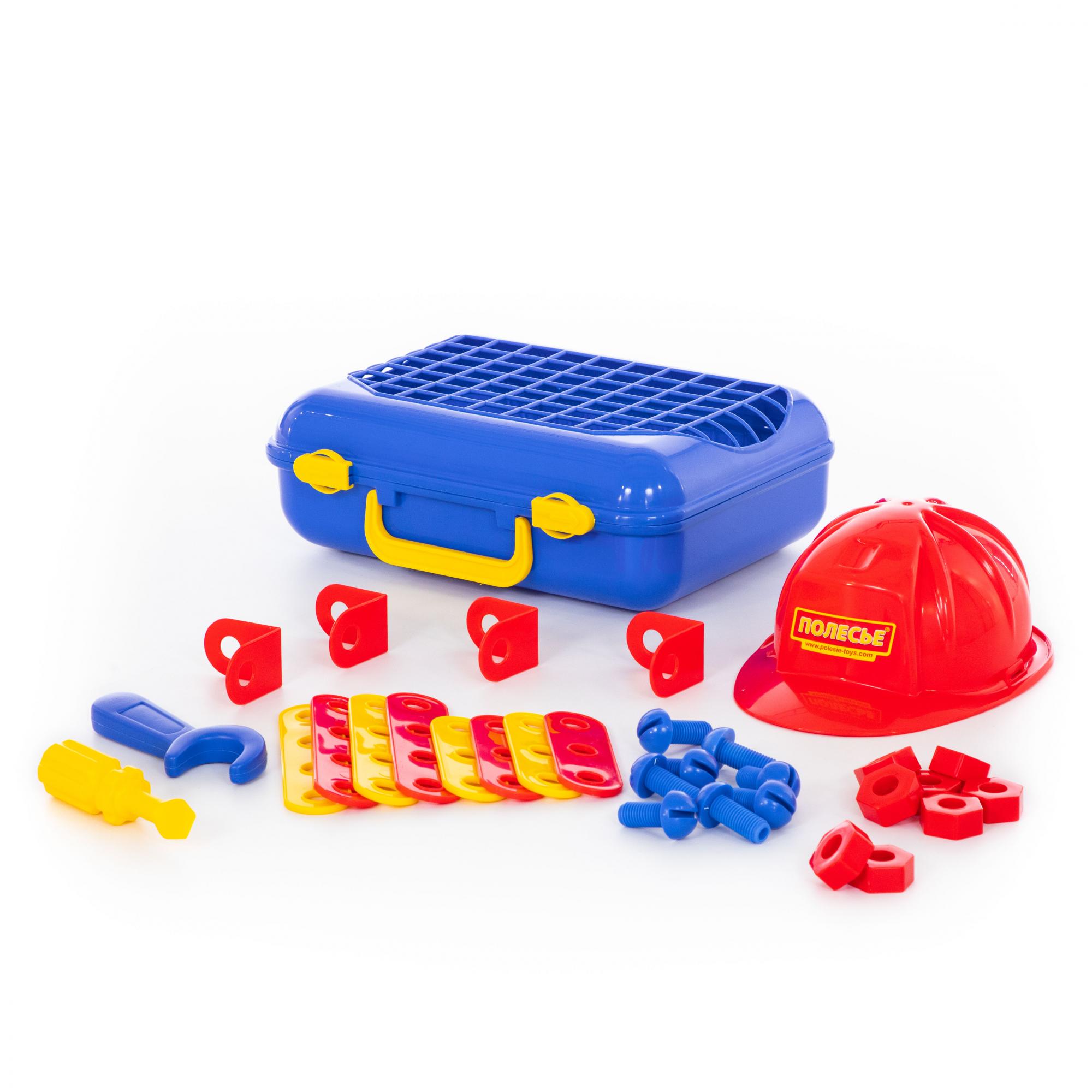 Набор для мальчиков состоит из отвертки, гаечного ключа, а также соединительных пластин, уголков, винтов, гаек и самого главного атрибута слесаря - каски.