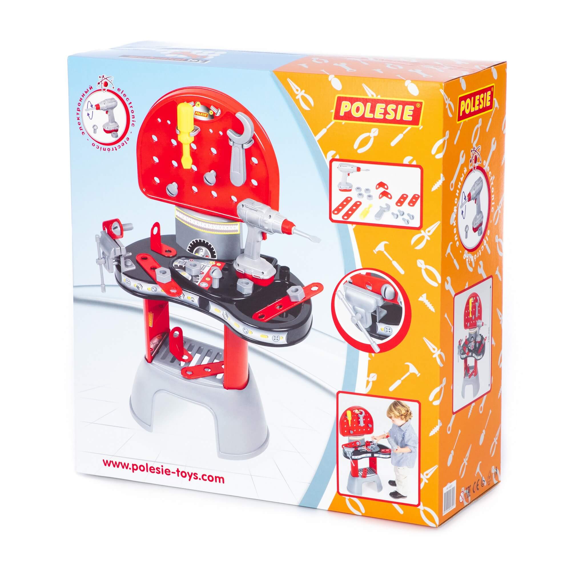 Комплекс представляет собой рабочий стол верстак с полочкой для деталей, навесными держателями инструментов, перфорированной столешницей. Особенность набора - электронный шуруповерт, входящий в комплект. С помощью электронного шуруповерта ребенок может откручивать и прикручивать к столешнице винты, присоединять пластины. Кроме того, мальчик познакомится с такими инструментами как отвертка, гаечный ключ, тиски. В набор входят винты 4 шт., гайки 4 шт., соединительные пластины 4 шт. и уголки 2 шт..