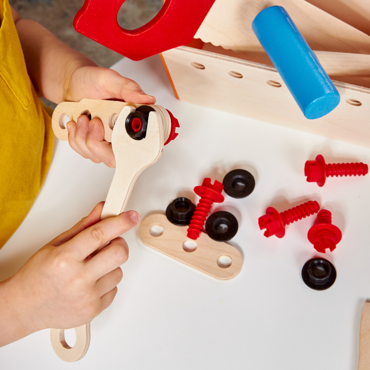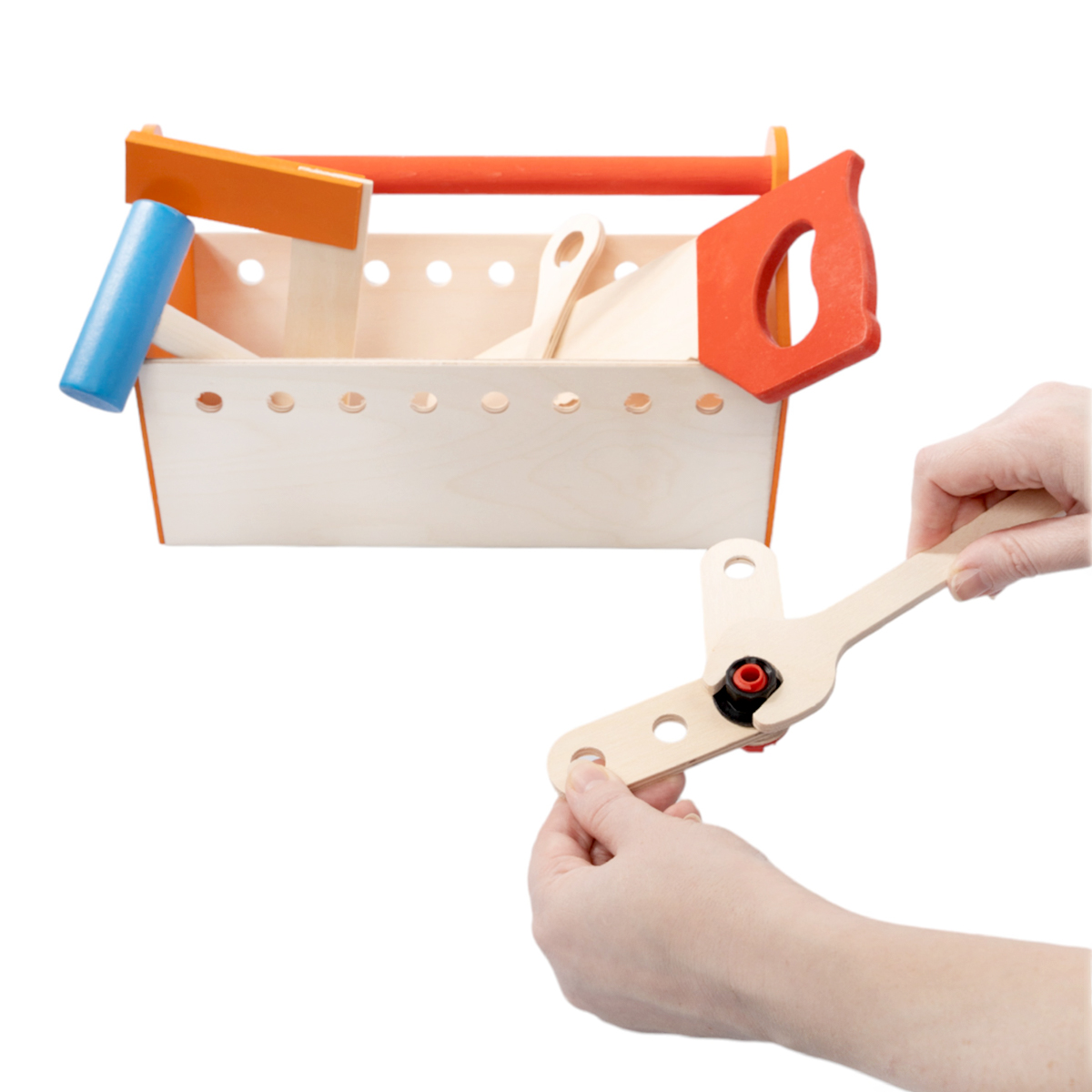 Набор строительных инструментов для детей (большой).Состав: молоток (ручка – 1,8 х 18 см; голова – 3 х 9,2 см), пила (27,5 х 10,5 х 1 см), ключ (19,5 х 4,5 х 0,6 см), отвертка (14,5 х 4 х 0,6 см), уголок (ручка – 1,8 х 3,2 х 0,3 см; окрашенная часть – 10,5 х 3,3 х 1 см), плашки большие – 2 шт. (12,5 х 3 х 0,6 см), плашки маленькие – 2 шт. (9,5 х 3 х 0,6 см), болты – 6 шт., гайки – 6 шт., ящик для инструментов – 1 шт. (29 х 14,5 х 19 см). Материал: дерево, древесные материалы. Рекомендовано для детей от 3 лет. С набором инструментов ребёнок развивает мелкую моторику, фантазию, воображение и пространственное мышление, знакомится с назначением того или иного приспособления в быту.