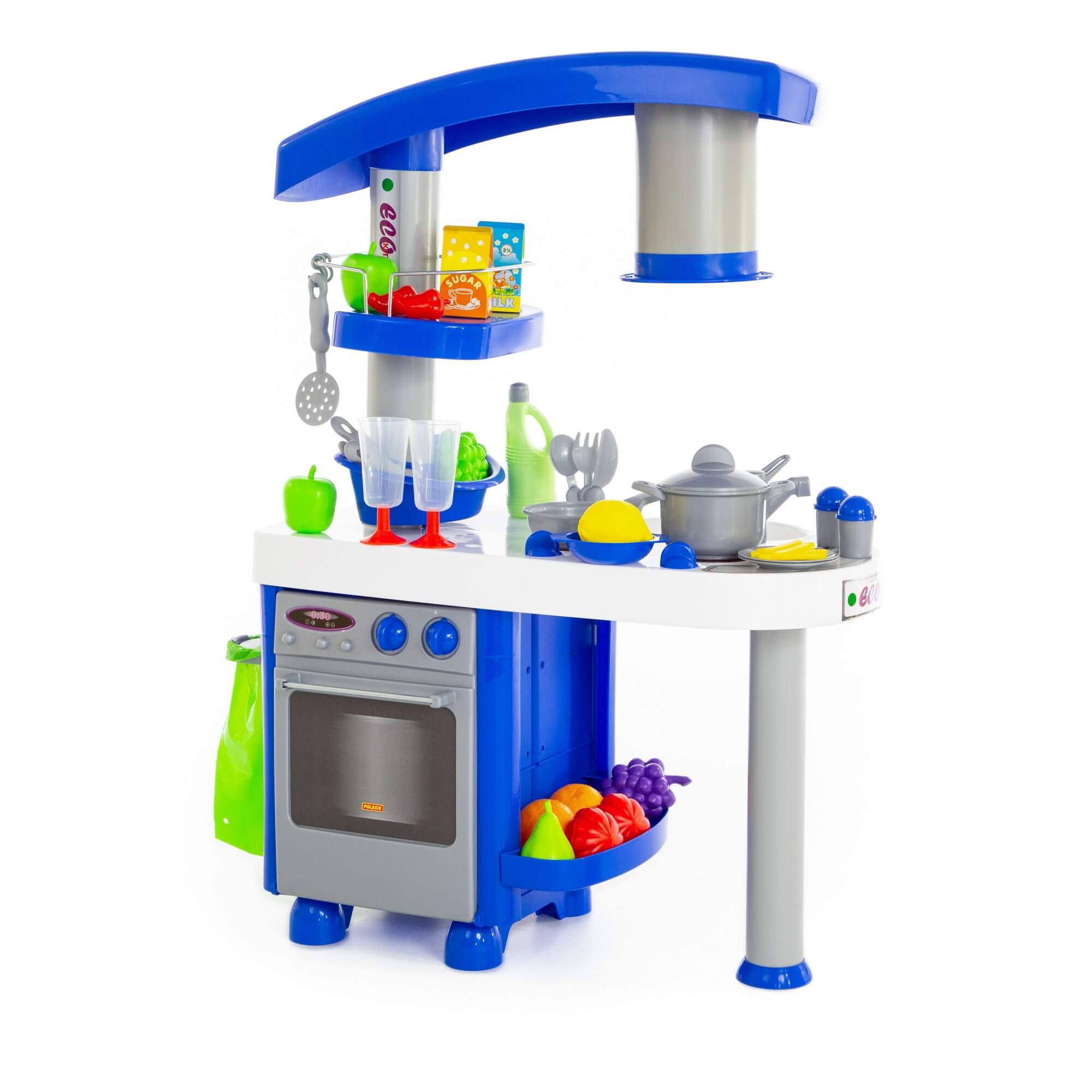 Кухня представляет собой большую рабочую поверхность для приготовления пищи с игрушечными вытяжкой, духовым шкафом и даже холодильником. Набор дополнен детской посудкой, принадлежностями для сервировки стола и бутафорскими продуктами питания.