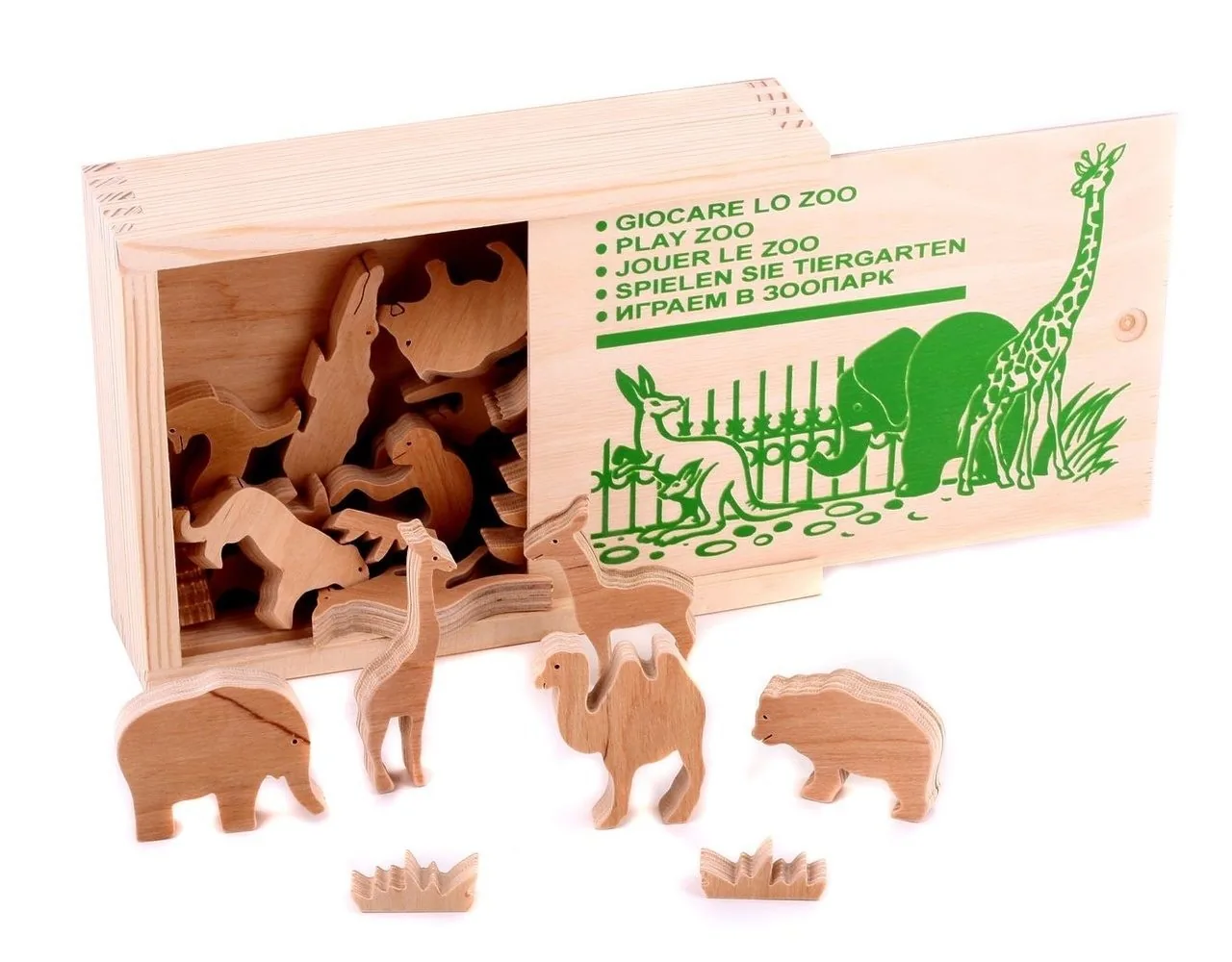 В этом зоопарке вы найдете: 18 силуэтных деревянных неокрашенных фигурок животных, а также 2 елочки, 1 лиственное дерево и 3 кустика. Фигурки представляют наиболее распространенных животных, о которых детям читали, рассказывали: корова, лошадь, заяц, белочка, лиса, медведь, кабан, слон, жираф, носорог, лев, кенгуру и т.д. На одной из сторон фигурки-силуэта размером 5х4х1,2см нанесены штрихом глаз и рот. Все фигурки уложены в деревянную коробку с крышкой-задвижкой.