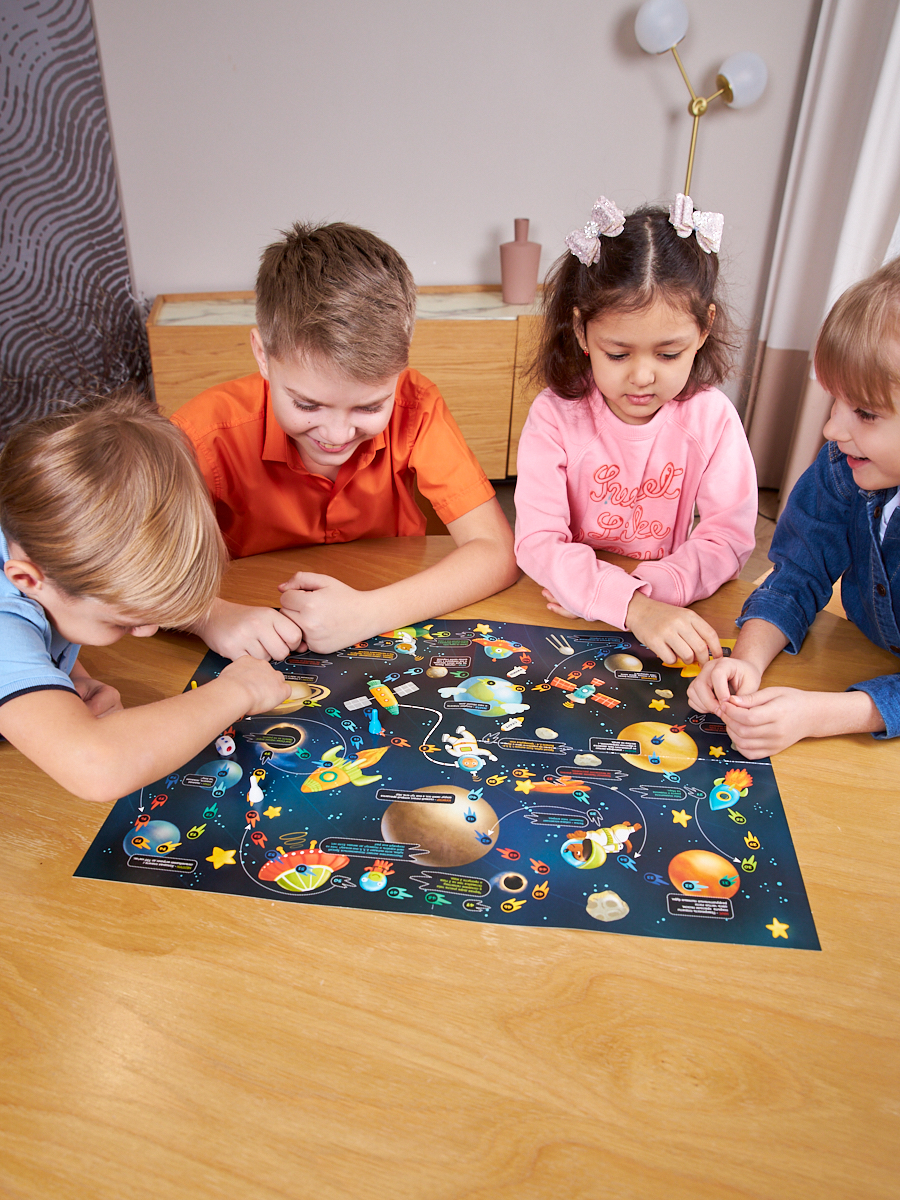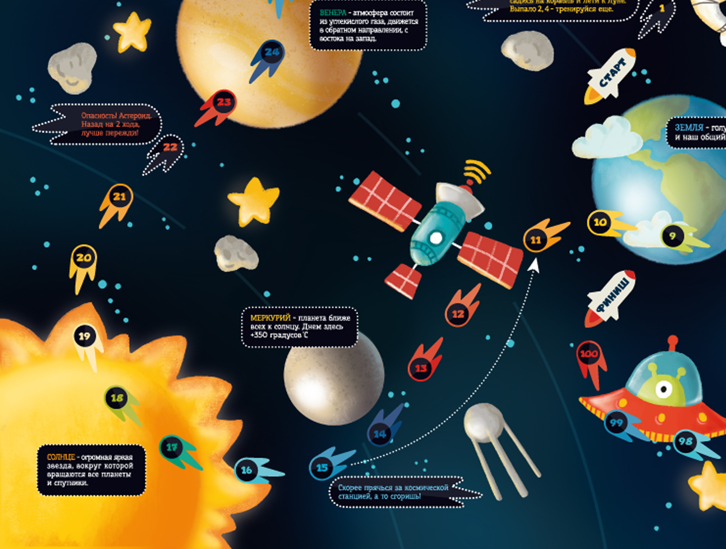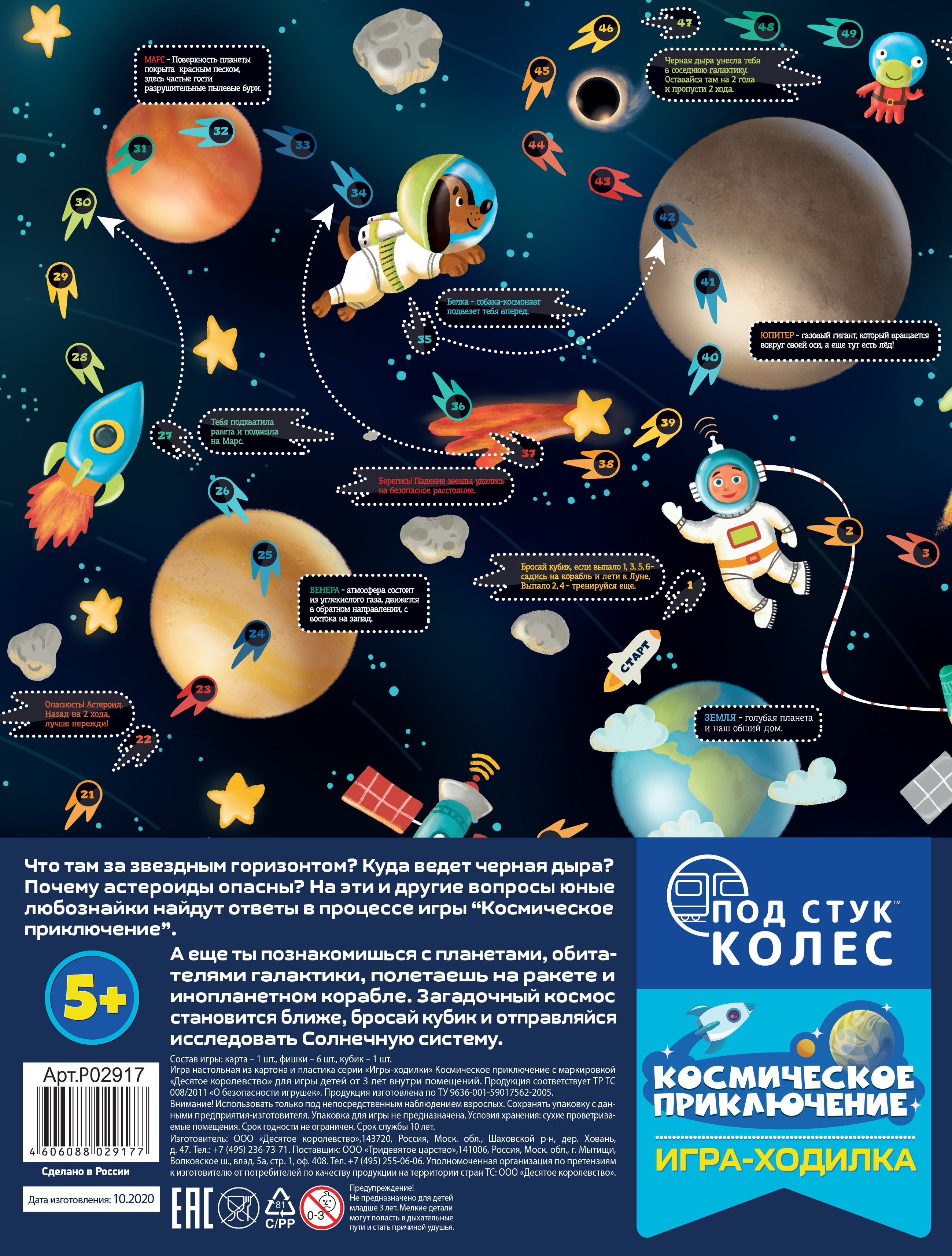Что там, за звездным горизонтом? Куда ведёт черная дыра? Почему астероиды опасны? На эти и другие вопросы юные любознатели найдут ответы, играя в «Космическое приключение». Ребёнок познакомится с планетами, обитателями Галактики, полетает на ракете и инопланетном корабле. Загадочный космос становится ближе: бросай кубик и отправляйся исследовать Солнечную систему!