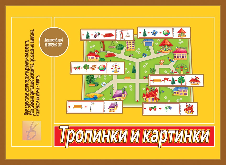 36 карточек со схемами тропинок, 36 карточек с рисунками и 6 больших карт