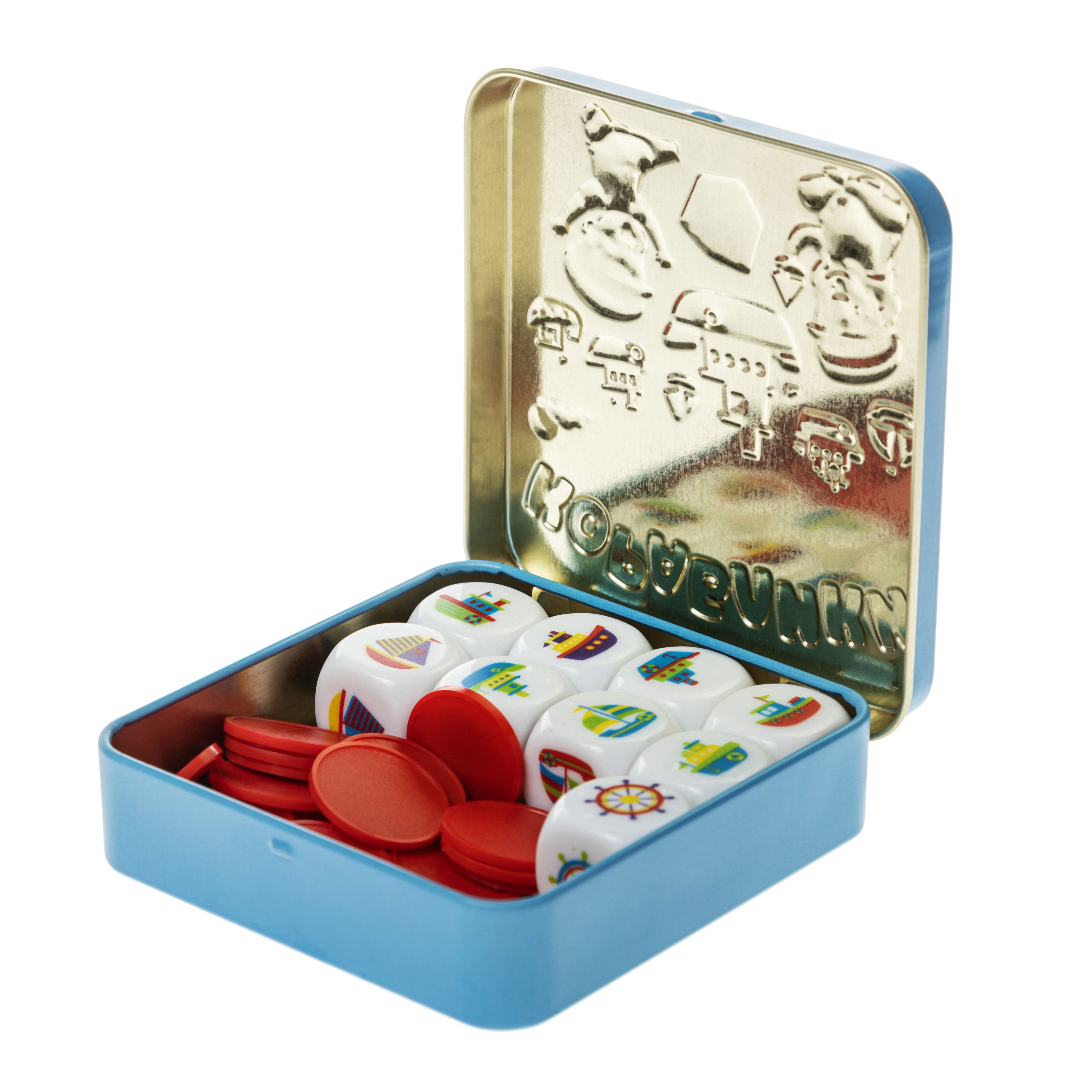 Настольная игра «Кораблики» в жестяной коробочке (серия «Игры в табакерке»). Состав игры: пластиковые кубики – 9 шт. (18 х 18 мм), жетоны – 20 шт. (21 мм диаметр), правила игры. Материалы: пластмасса, картон, бумага. Для детей от 5 лет, от 2 до 6 игроков. Игра развивает реакцию, внимание к деталям, концентрацию.