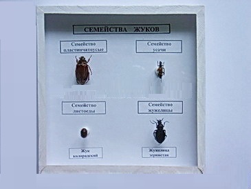 В монтажной коробке под стеклом представлены (не менее 2-ух) насекомые некоторых семейств отряда Жуки (Жесткокрылые). Все они имеют плотные жесткие надкрылья, прикрывающие вторую пару кожистых крыльев, при помощи которых они летают и грызущий ротовой аппарат.